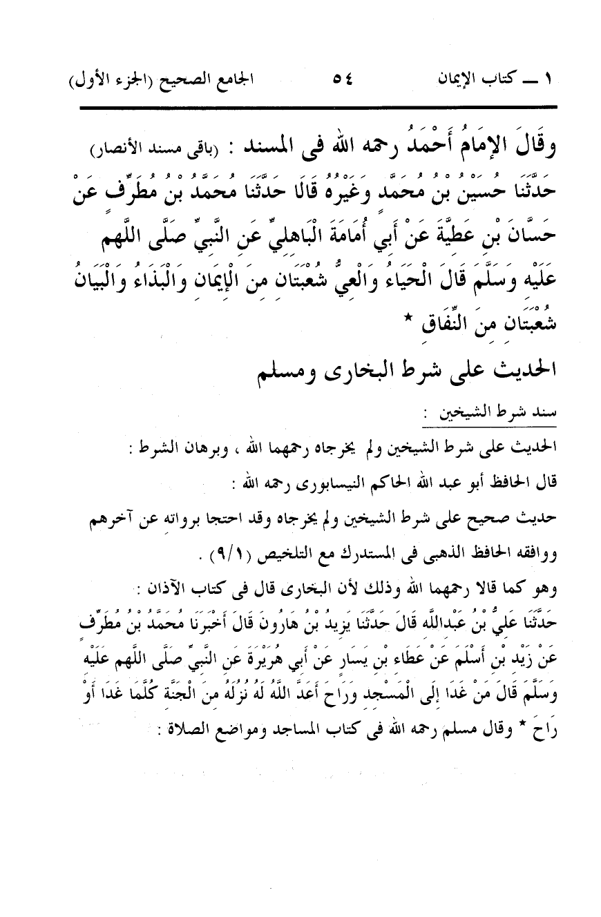حَدَّثَنَا حُسَيْنُ بْنُ مُحَمَّدٍ وَغَيْرُهُ قَالَا حَدَّثَنَا مُحَمَّدُ بْنُ مُطَرِّفٍ عَنْ حَسَّانَ بْنِ عَطِيَّةَ عَنْ أَبِي أُمَامَةَ الْبَاهِلِيِّ عَنِ النَّبِيِّ صَلَّى اللَّهم عَلَيْهِ وَسَلَّمَ قَالَ الْحَيَاءُ وَالْعِيُّ شُعْبَتَانِ مِنَ الْإِيمَانِ وَالْبَذَاءُ وَالْبَيَانُ شُعْبَتَانِ مِنَ النِّفَاقِ *