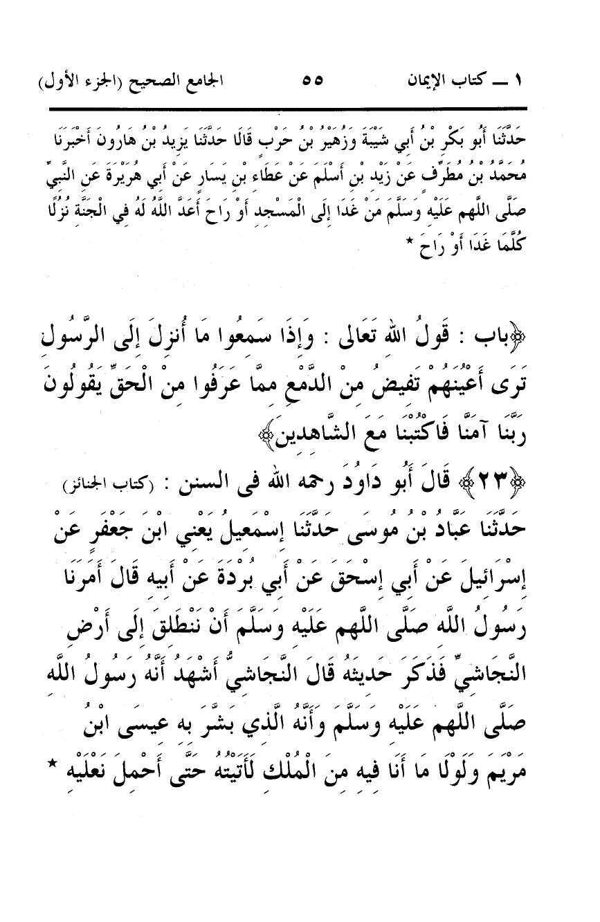 23 - قَالَ أَبُو دَاوُدَ رحمه الله فى السنن: (كتاب الجنائز) حَدَّثَنَا عَبَّادُ بْنُ مُوسَى حَدَّثَنَا إِسْمَعِيلُ يَعْنِي ابْنَ جَعْفَرٍ عَنْ إِسْرَائِيلَ عَنْ أَبِي إِسْحَقَ عَنْ أَبِي بُرْدَةَ عَنْ أَبِيهِ قَالَ أَمَرَنَا رَسُولُ اللَّهِ صَلَّى اللَّهم عَلَيْهِ وَسَلَّمَ أَنْ نَنْطَلِقَ إِلَى أَرْضِ النَّجَاشِيِّ فَذَكَرَ حَدِيثَهُ قَالَ النَّجَاشِيُّ أَشْهَدُ أَنَّهُ رَسُولُ اللَّهِ صَلَّى اللَّهم عَلَيْهِ وَسَلَّمَ وَأَنَّهُ الَّذِي بَشَّرَ بِهِ عِيسَى ابْنُ مَرْيَمَ وَلَوْلَا مَا أَنَا فِيهِ مِنَ الْمُلْكِ لَأَتَيْتُهُ حَتَّى أَحْمِلَ نَعْلَيْهِ *