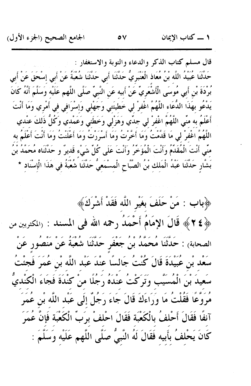 24 - قَالَ الإمَامُ أَحْمَدُ رحمه الله فى المسند: (المكثريين من الصحابة): حَدَّثَنَا مُحَمَّدُ بْنُ جَعْفَرٍ حَدَّثَنَا شُعْبَةُ عَنْ مَنْصُورٍ عَنْ سَعْدِ بْنِ عُبَيْدَةَ قَالَ كُنْتُ جَالِسًا عِنْدَ عَبْدِ اللَّهِ بْنِ عُمَرَ فَجِئْتُ سَعِيدَ بْنَ الْمُسَيَّبِ وَتَرَكْتُ عِنْدَهُ رَجُلًا مِنْ كِنْدَةَ فَجَاءَ الْكِنْدِيُّ مُرَوَّعًا فَقُلْتُ مَا وَرَاءَكَ قَالَ جَاءَ رَجُلٌ إِلَى عَبْدِ اللَّهِ بْنِ عُمَرَ آنِفًا فَقَالَ أَحْلِفُ بِالْكَعْبَةِ فَقَالَ احْلِفْ بِرَبِّ الْكَعْبَةِ فَإِنَّ عُمَرَ كَانَ يَحْلِفُ بِأَبِيهِ فَقَالَ لَهُ النَّبِيُّ صَلَّى اللَّهم عَلَيْهِ وَسَلَّمَ: