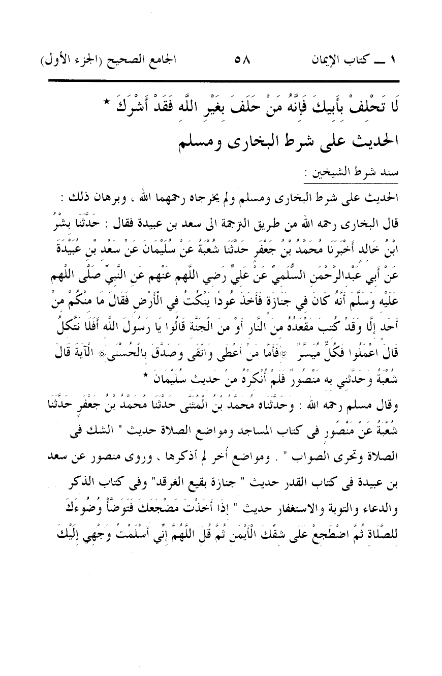 قال البخارى رحمه الله من طريق الترجمة الى سعد بن عبيدة فقال: حَدَّثَنَا بِشْرُ ابْنُ خَالِدٍ أَخْبَرَنَا مُحَمَّدُ بْنُ جَعْفَرٍ حَدَّثَنَا شُعْبَةُ عَنْ سُلَيْمَانَ عَنْ سَعْدِ بْنِ عُبَيْدَةَ عَنْ أَبِي عَبْدِالرَّحْمَنِ السُّلَمِيِّ عَنْ عَلِيٍّ رَضِي اللَّهم عَنْهم عَنِ النَّبِيِّ صَلَّى اللَّهم عَلَيْهِ وَسَلَّمَ أَنَّهُ كَانَ فِي جَنَازَةٍ فَأَخَذَ عُودًا يَنْكُتُ فِي الْأَرْضِ فَقَالَ مَا مِنْكُمْ مِنْ أَحَدٍ إِلَّا وَقَدْ كُتِبَ مَقْعَدُهُ مِنَ النَّارِ أَوْ مِنَ الْجَنَّةِ قَالُوا يَا رَسُولَ اللَّهِ أَفَلَا نَتَّكِلُ قَالَ اعْمَلُوا فَكُلٌّ مُيَسَّرٌ {فَأَمَّا مَنْ أَعْطَى وَاتَّقَى وَصَدَّقَ بِالْحُسْنَى} الْآيَةَ قَالَ شُعْبَةُ وَحَدَّثَنِي بِهِ مَنْصُورٌ فَلَمْ أُنْكِرْهُ مِنْ حَدِيثِ سُلَيْمَانَ *