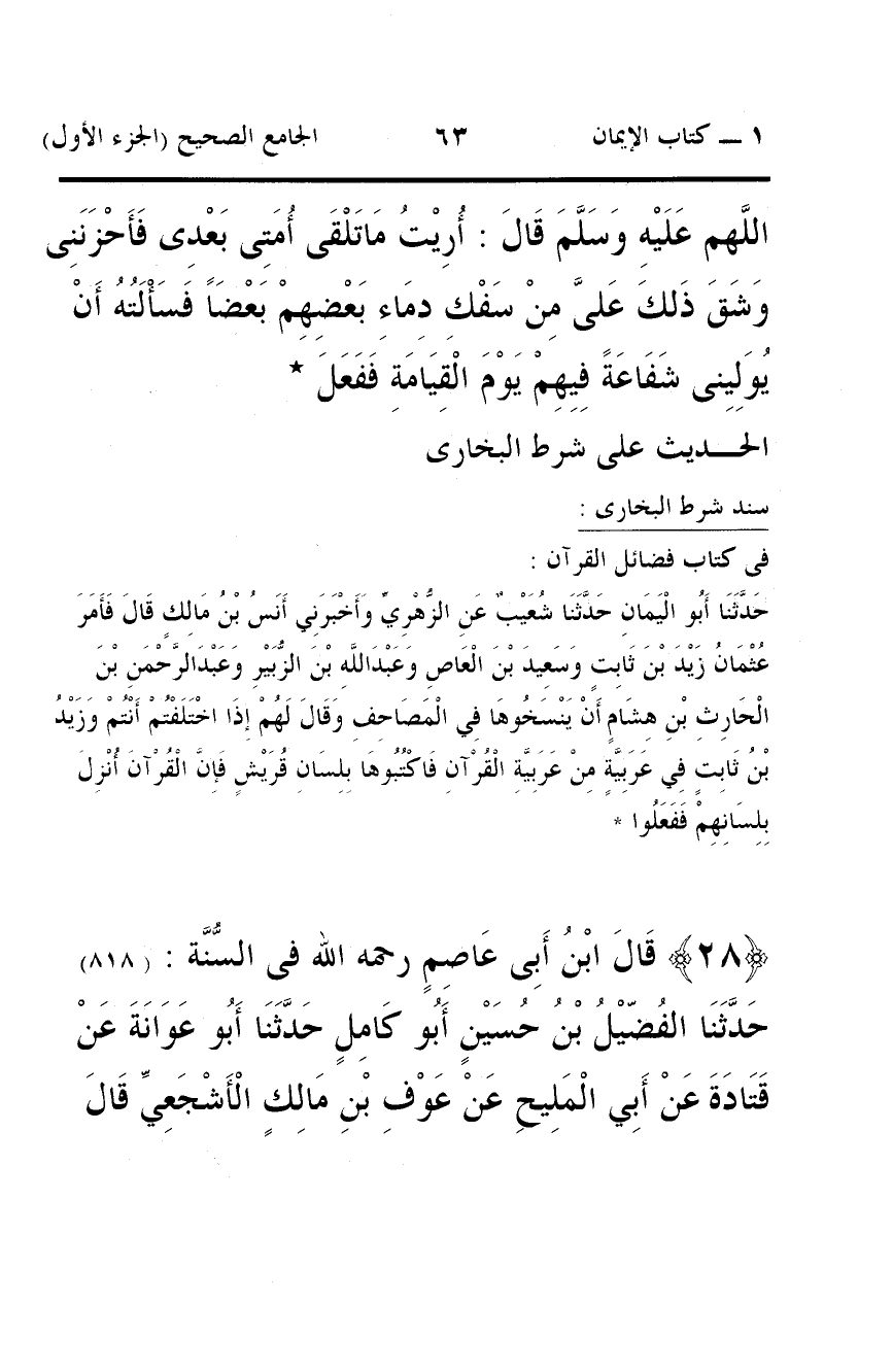 28 - قَالَ ابْنُ أَبِى عَاصِمٍ رحمه الله فى السُّنَّة: (818) حَدَّثَنَا الفُضّيْلُ بْنُ حُسَيْنٍ أَبُو كَامِلٍ حَدَّثَنَا أَبُو عَوَانَةَ عَنْ قَتَادَةَ عَنْ أَبِي الْمَلِيحِ عَنْ عَوْفِ بْنِ مَالِكٍ الْأَشْجَعِيِّ قَالَ