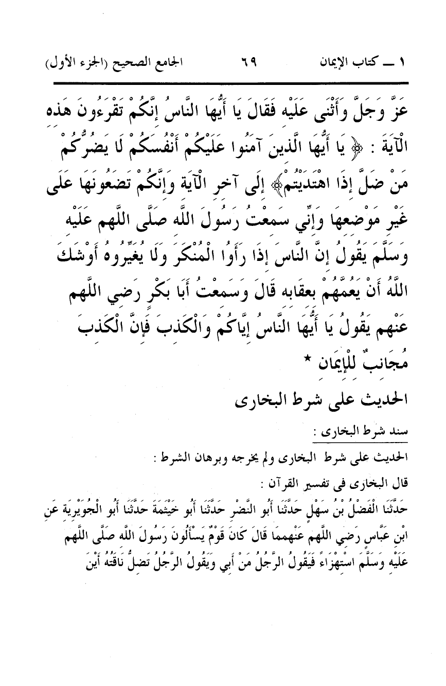 عَزَّ وَجَلَّ وَأَثْنَى عَلَيْهِ فَقَالَ يَا أَيُّهَا النَّاسُ إِنَّكُمْ تَقْرَءُونَ هَذِهِ الْآيَةَ: {يَا أَيُّهَا الَّذِينَ آمَنُوا عَلَيْكُمْ أَنْفُسَكُمْ لَا يَضُرُّكُمْ مَنْ ضَلَّ إِذَا اهْتَدَيْتُمْ} إِلَى آخِرِ الْآيَةِ وَإِنَّكُمْ تَضَعُونَهَا عَلَى غَيْرِ مَوْضِعِهَا وَإِنِّي سَمِعْتُ رَسُولَ اللَّهِ صَلَّى اللَّهم عَلَيْهِ وَسَلَّمَ يَقُولُ إِنَّ النَّاسَ إِذَا رَأَوُا الْمُنْكَرَ وَلَا يُغَيِّرُوهُ أَوْشَكَ اللَّهُ أَنْ يَعُمَّهُمْ بِعِقَابِهِ قَالَ وَسَمِعْتُ أَبَا بَكْرٍ رَضِي اللَّهم عَنْهم يَقُولُ يَا أَيُّهَا النَّاسُ إِيَّاكُمْ وَالْكَذِبَ فَإِنَّ الْكَذِبَ مُجَانِبٌ لِلْإِيمَانِ *