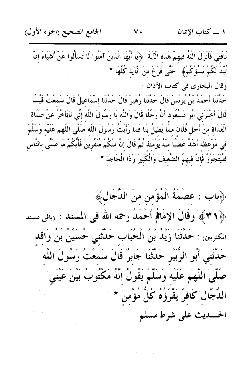 31 - وقَالَ الإمَامُ أَحْمَدُ رحمه الله فى المسند: (باقى مسند المكثريين): حَدَّثَنَا زَيْدُ بْنُ الْحُبَابِ حَدَّثَنِي حُسَيْنُ بْنُ وَاقِدٍ حَدَّثَنِي أَبُو الزُّبَيْرِ حَدَّثَنَا جَابِرٌ قَالَ سَمِعْتُ رَسُولَ اللَّهِ صَلَّى اللَّهم عَلَيْهِ وَسَلَّمَ يَقُولُ إِنَّهُ مَكْتُوبٌ بَيْنَ عَيْنَيِ الدَّجَّالِ كَافِرٌ يَقْرَؤُهُ كُلُّ مُؤْمِنٍ *