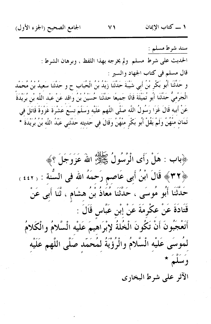 32 - قَالَ ابْنُ أَبِى عَاصِمٍ رَحِمَهُ الله فى السُّنةِ: (442) حَدَّثَنَا أَبُو مُوسَى، حَدَّثَنَا مُعَاذُ بْنُ هِشَامٍ، ثَّنَا أَبِى عَنْ قَتَادَةَ عَنْ عِكْرِمَةَ عَنْ إِبْنِ عَبَّاسٍ قَاَلَ: أَتَعْجَبُونَ أَنْ تَكُونَ الْخُلةُ لإبْرَاهِيمَ عَليْهِ الْسَّلامُ والْكَلامُ لِمُوسَى عَليْهِ الْسَّلامُ والْرُؤْيَةُ لِمُحَمّدٍ صَلَّى اللَّهم عَلَيْهِ وَسَلَّمَ *
