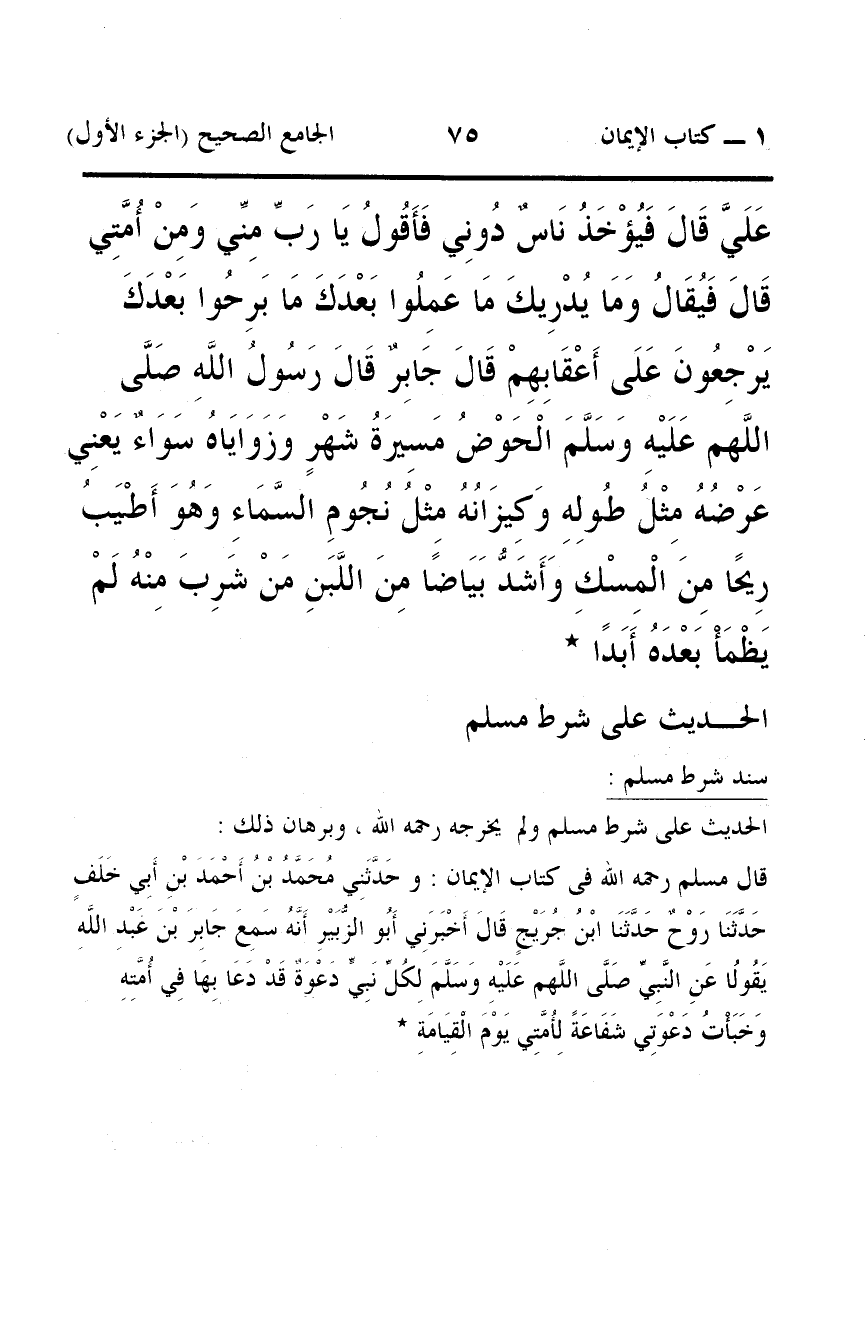 عَلَيَّ قَالَ فَيُؤْخَذُ نَاسٌ دُونِي فَأَقُولُ يَا رَبِّ مِنِّي وَمِنْ أُمَّتِي قَالَ فَيُقَالُ وَمَا يُدْرِيكَ مَا عَمِلُوا بَعْدَكَ مَا بَرِحُوا بَعْدَكَ يَرْجِعُونَ عَلَى أَعْقَابِهِمْ قَالَ جَابِرٌ قَالَ رَسُولُ اللَّهِ صَلَّى اللَّهم عَلَيْهِ وَسَلَّمَ الْحَوْضُ مَسِيرَةُ شَهْرٍ وَزَوَايَاهُ سَوَاءٌ يَعْنِي عَرْضُهُ مِثْلُ طُولِهِ وَكِيزَانُهُ مِثْلُ نُجُومِ السَّمَاءِ وَهُوَ أَطْيَبُ رِيحًا مِنَ الْمِسْكِ وَأَشَدُّ بَيَاضًا مِنَ اللَّبَنِ مَنْ شَرِبَ مِنْهُ لَمْ يَظْمَا بَعْدَهُ أَبَدًا *
