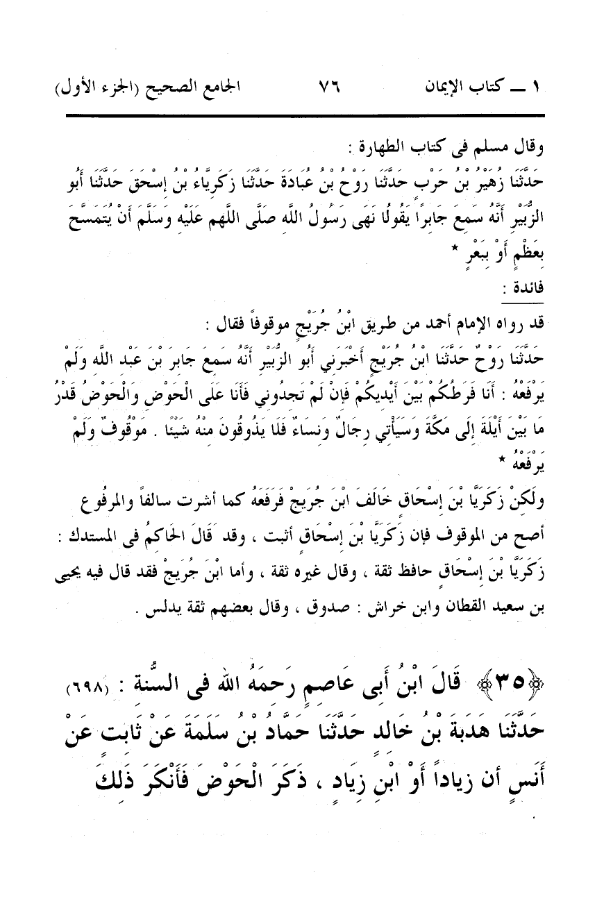 35 - قَالَ ابْنُ أَبِى عَاصِمٍ رَحِمَهُ الله فى السُّنةِ: (698) حَدَّثَنَا هَدَبةَ بْنُ خَالِدٍ حَدَّثَنَا حَمَّادُ بْنُ سَلَمَةَ عَنْ ثَابِتٍ عَنْ أَنَسٍ أن زياداً أَوْ ابْنِ زِيَادٍ، ذَكَرَ الْحَوْضَ فَأَنْكَرَ ذَلِكَ