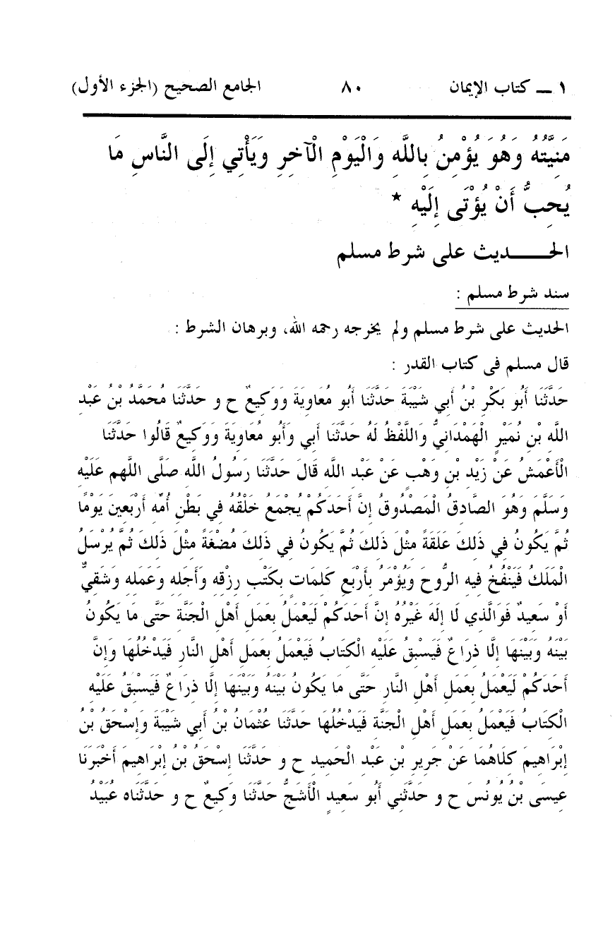 حَدَّثَنَا أَبُو بَكْرِ بْنُ أَبِي شَيْبَةَ حَدَّثَنَا أَبُو مُعَاوِيَةَ وَوَكِيعٌ ح وحَدَّثَنَا مُحَمَّدُ بْنُ عَبْدِ اللَّهِ بْنِ نُمَيْرٍ الْهَمْدَانِيُّ وَاللَّفْظُ لَهُ حَدَّثَنَا أَبِي وَأَبُو مُعَاوِيَةَ وَوَكِيعٌ قَالُوا حَدَّثَنَا الْأَعْمَشُ عَنْ زَيْدِ بْنِ وَهْبٍ عَنْ عَبْدِ اللَّهِ قَالَ حَدَّثَنَا رَسُولُ اللَّهِ صَلَّى اللَّهم عَلَيْهِ وَسَلَّمَ وَهُوَ الصَّادِقُ الْمَصْدُوقُ إِنَّ أَحَدَكُمْ يُجْمَعُ خَلْقُهُ فِي بَطْنِ أُمِّهِ أَرْبَعِينَ يَوْمًا ثُمَّ يَكُونُ فِي ذَلِكَ عَلَقَةً مِثْلَ ذَلِكَ ثُمَّ يَكُونُ فِي ذَلِكَ مُضْغَةً مِثْلَ ذَلِكَ ثُمَّ يُرْسَلُ الْمَلَكُ فَيَنْفُخُ فِيهِ الرُّوحَ وَيُؤْمَرُ بِأَرْبَعِ كَلِمَاتٍ بِكَتْبِ رِزْقِهِ وَأَجَلِهِ وَعَمَلِهِ وَشَقِيٌّ أَوْ سَعِيدٌ فَوَالَّذِي لَا إِلَهَ غَيْرُهُ إِنَّ أَحَدَكُمْ لَيَعْمَلُ بِعَمَلِ أَهْلِ الْجَنَّةِ حَتَّى مَا يَكُونُ بَيْنَهُ وَبَيْنَهَا إِلَّا ذِرَاعٌ فَيَسْبِقُ عَلَيْهِ الْكِتَابُ فَيَعْمَلُ بِعَمَلِ أَهْلِ النَّارِ فَيَدْخُلُهَا وَإِنَّ أَحَدَكُمْ لَيَعْمَلُ بِعَمَلِ أَهْلِ النَّارِ حَتَّى مَا يَكُونُ بَيْنَهُ وَبَيْنَهَا إِلَّا ذِرَاعٌ فَيَسْبِقُ عَلَيْهِ الْكِتَابُ فَيَعْمَلُ بِعَمَلِ أَهْلِ الْجَنَّةِ فَيَدْخُلُهَا حَدَّثَنَا عُثْمَانُ بْنُ أَبِي شَيْبَةَ وَإِسْحَقُ بْنُ إِبْرَاهِيمَ كِلَاهُمَا عَنْ جَرِيرِ بْنِ عَبْدِ الْحَمِيدِ ح وحَدَّثَنَا إِسْحَقُ بْنُ إِبْرَاهِيمَ أَخْبَرَنَا عِيسَى بْنُ يُونُسَ ح وحَدَّثَنِي أَبُو سَعِيدٍ الْأَشَجُّ حَدَّثَنَا وَكِيعٌ ح وحَدَّثَنَاه عُبَيْدُ