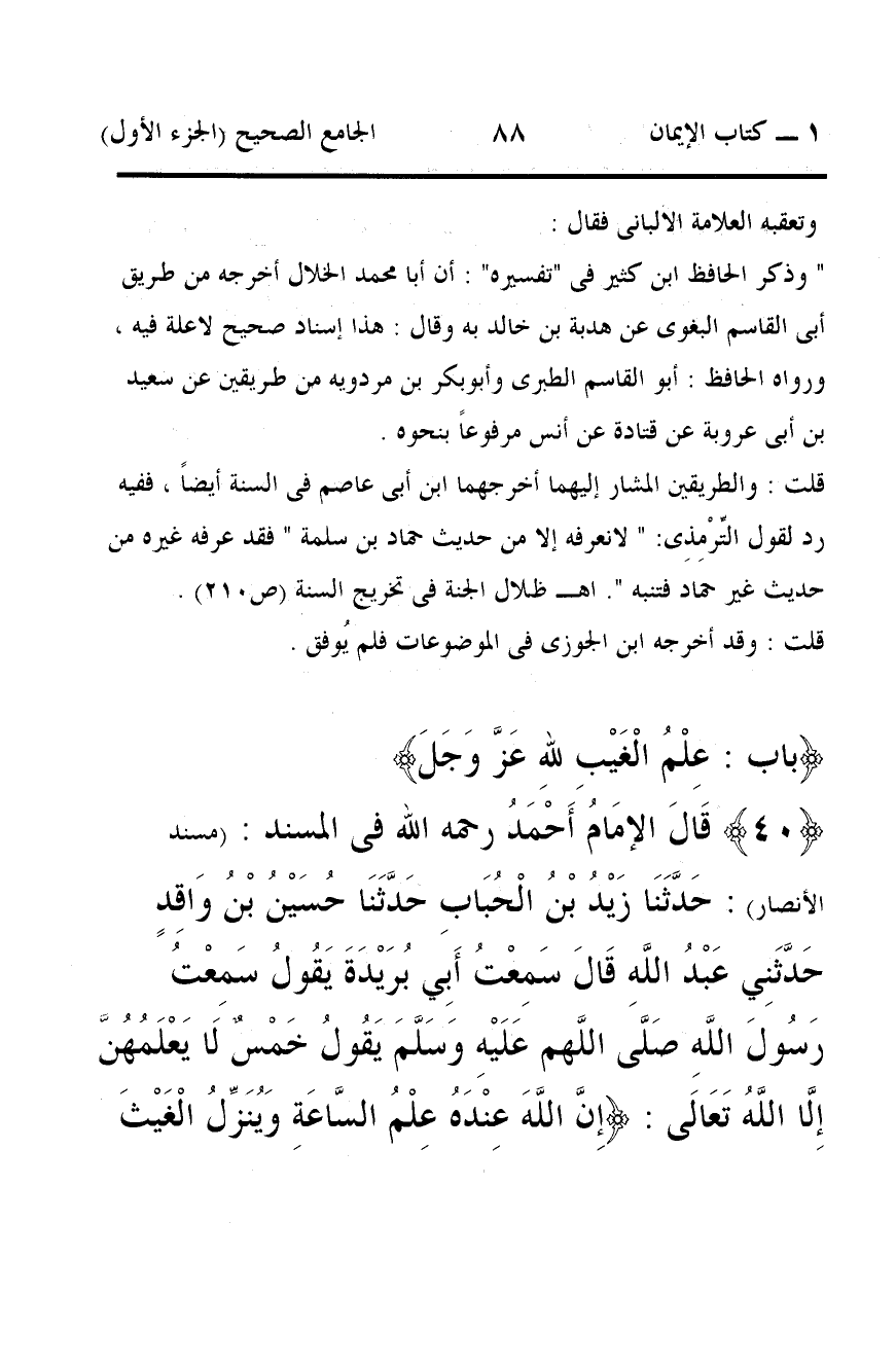 قلت: والطريقين المشار إليهما أخرجهما ابن أبى عاصم فى السنة أيضاً، ففيه رد لقول التِّرْمِذِى: " لانعرفه إلا من حديث حماد بن سلمة " فقد عرفه غيره من حديث غير حماد فتنبه ". اهـ ظلال الجنة فى تخريج السنة (ص210).