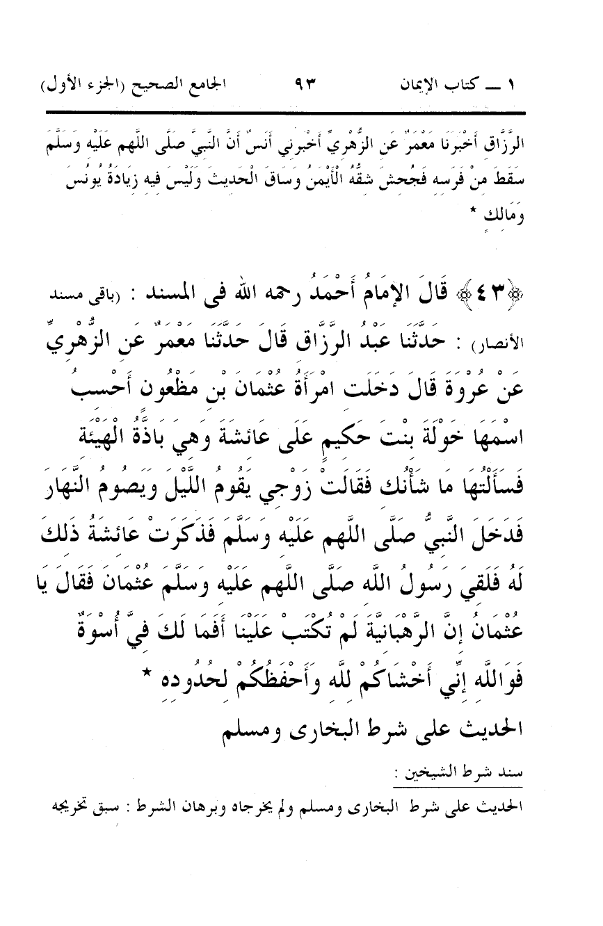 43 - قَالَ الإمَامُ أَحْمَدُ رحمه الله فى المسند: (باقى مسند الأنصار): حَدَّثَنَا عَبْدُ الرَّزَّاقِ قَالَ حَدَّثَنَا مَعْمَرٌ عَنِ الزُّهْرِيِّ عَنْ عُرْوَةَ قَالَ دَخَلَتِ امْرَأَةُ عُثْمَانَ بْنِ مَظْعُونٍ أَحْسِبُ اسْمَهَا خَوْلَةَ بِنْتَ حَكِيمٍ عَلَى عَائِشَةَ وَهِيَ بَاذَّةُ الْهَيْئَةِ فَسَأَلْتُهَا مَا شَانُكِ فَقَالَتْ زَوْجِي يَقُومُ اللَّيْلَ وَيَصُومُ النَّهَارَ فَدَخَلَ النَّبِيُّ صَلَّى اللَّهم عَلَيْهِ وَسَلَّمَ فَذَكَرَتْ عَائِشَةُ ذَلِكَ لَهُ فَلَقِيَ رَسُولُ اللَّهِ صَلَّى اللَّهم عَلَيْهِ وَسَلَّمَ عُثْمَانَ فَقَالَ يَا عُثْمَانُ إِنَّ الرَّهْبَانِيَّةَ لَمْ تُكْتَبْ عَلَيْنَا أَفَمَا لَكَ فِيَّ أُسْوَةٌ فَوَاللَّهِ إِنِّي أَخْشَاكُمْ لِلَّهِ وَأَحْفَظُكُمْ لِحُدُودِهِ *
