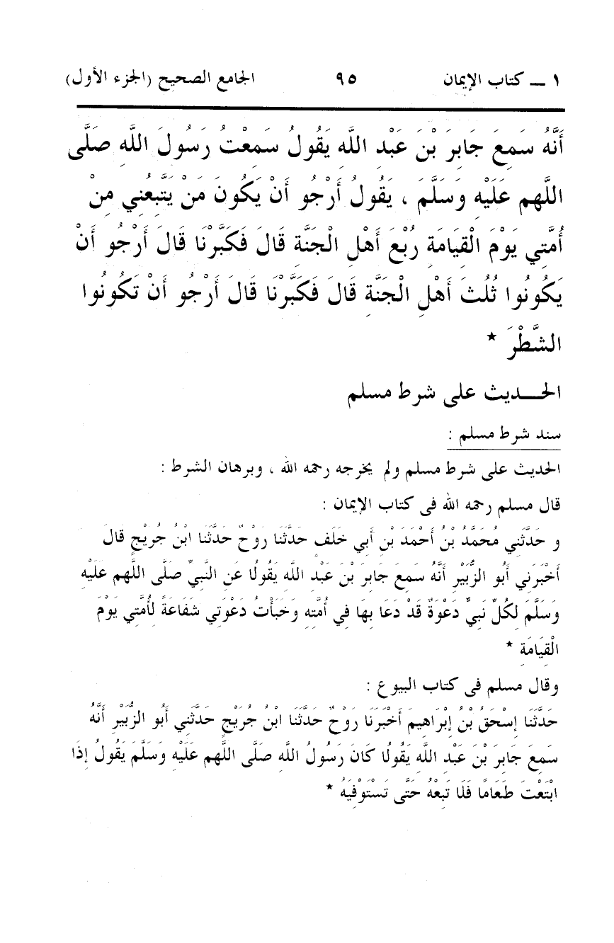 أَنَّهُ سَمِعَ جَابِرَ بْنَ عَبْدِ اللَّهِ يَقُولُ سَمِعْتُ رَسُولَ اللَّهِ صَلَّى اللَّهم عَلَيْهِ وَسَلَّمَ، يَقُولُ أَرْجُو أَنْ يَكُونَ مَنْ يَتَّبِعُنِي مِنْ أُمَّتِي يَوْمَ الْقِيَامَةِ رُبْعَ أَهْلِ الْجَنَّةِ قَالَ فَكَبَّرْنَا قَالَ أَرْجُو أَنْ يَكُونُوا ثُلُثَ أَهْلِ الْجَنَّةِ قَالَ فَكَبَّرْنَا قَالَ أَرْجُو أَنْ تَكُونُوا الشَّطْرَ *