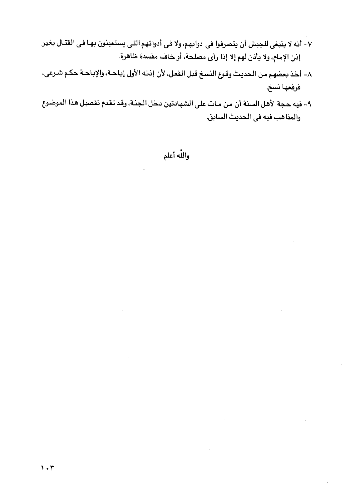 7 - أنه لا ينبغي للجيش أن يتصرفوا في دوابهم، ولا في أدواتهم التي يستعينون بها في القتال بغير إذن الإمام، ولا يأذن لهم إلا إذا رأى مصلحة، أو خاف مفسدة ظاهرة.