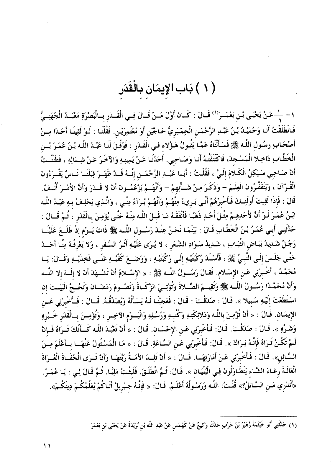 1 - عن يحيى بن يعمر قال: كان أول من قال في القدر بالبصرة معبد الجهني فانطلقت أنا وحميد بن عبد الرحمن الحميري حاجين أو معتمرين فقلنا: لو لقينا أحدا من أصحاب رسول الله صلى الله عليه وسلم فسألناه عما يقول هؤلاء في القدر: فوفق لنا عبد الله بن عمر بن الخطاب داخلا المسجد فاكتنفته أنا وصاحبي أحدنا عن يمينه والآخر عن شماله فظننت أن صاحبي سيكل الكلام إلي فقلت: أبا عبد الرحمن إنه قد ظهر قبلنا ناس يقرءون القرآن ويتقفرون العلم -وذكر من شأنهم- وأنهم يزعمون أن لا قدر وأن الأمر أنف. قال فإذا لقيت أولئك فأخبرهم أني بريء منهم وأنهم برآء مني والذي يحلف به عبد الله بن عمر لو أن لأحدهم مثل أحد ذهبا فأنفقه ما قبل الله منه حتى يؤمن بالقدر ثم قال: حدثني أبي عمر بن الخطاب قال: بينما نحن عند رسول الله صلى الله عليه وسلم ذات يوم إذ طلع علينا رجل شديد بياض الثياب شديد سواد الشعر لا يرى عليه أثر السفر ولا يعرفه منا أحد حتى جلس إلى النبي صلى الله عليه وسلم فأسند ركبتيه إلى ركبتيه ووضع كفيه على فخذيه وقال يا محمد أخبرني عن الإسلام فقال رسول الله صلى الله عليه وسلم: "الإسلام أن تشهد أن لا إله إلا الله وأن محمدا رسول الله صلى الله عليه وسلم وتقيم الصلاة وتؤتي الزكاة وتصوم رمضان وتحج البيت إن استطعت إليه سبيلا " قال صدقت قال فعجبنا له يسأله ويصدقه. قال: فأخبرني عن الإيمان قال: "أن تؤمن بالله وملائكته وكتبه ورسله واليوم الآخر وتؤمن بالقدر خيره وشره" قال صدقت قال فأخبرني عن الإحسان قال " أن تعبد الله كأنك تراه فإن لم تكن تراه فإنه يراك قال فأخبرني عن الساعة قال "ما المسئول عنها بأعلم من السائل " قال فأخبرني عن أمارتها قال: أن تلد الأمة ربتها وأن ترى الحفاة العراة العالة رعاء الشاء يتطاولون في البنيان " قال ثم انطلق. فلبثت مليا.