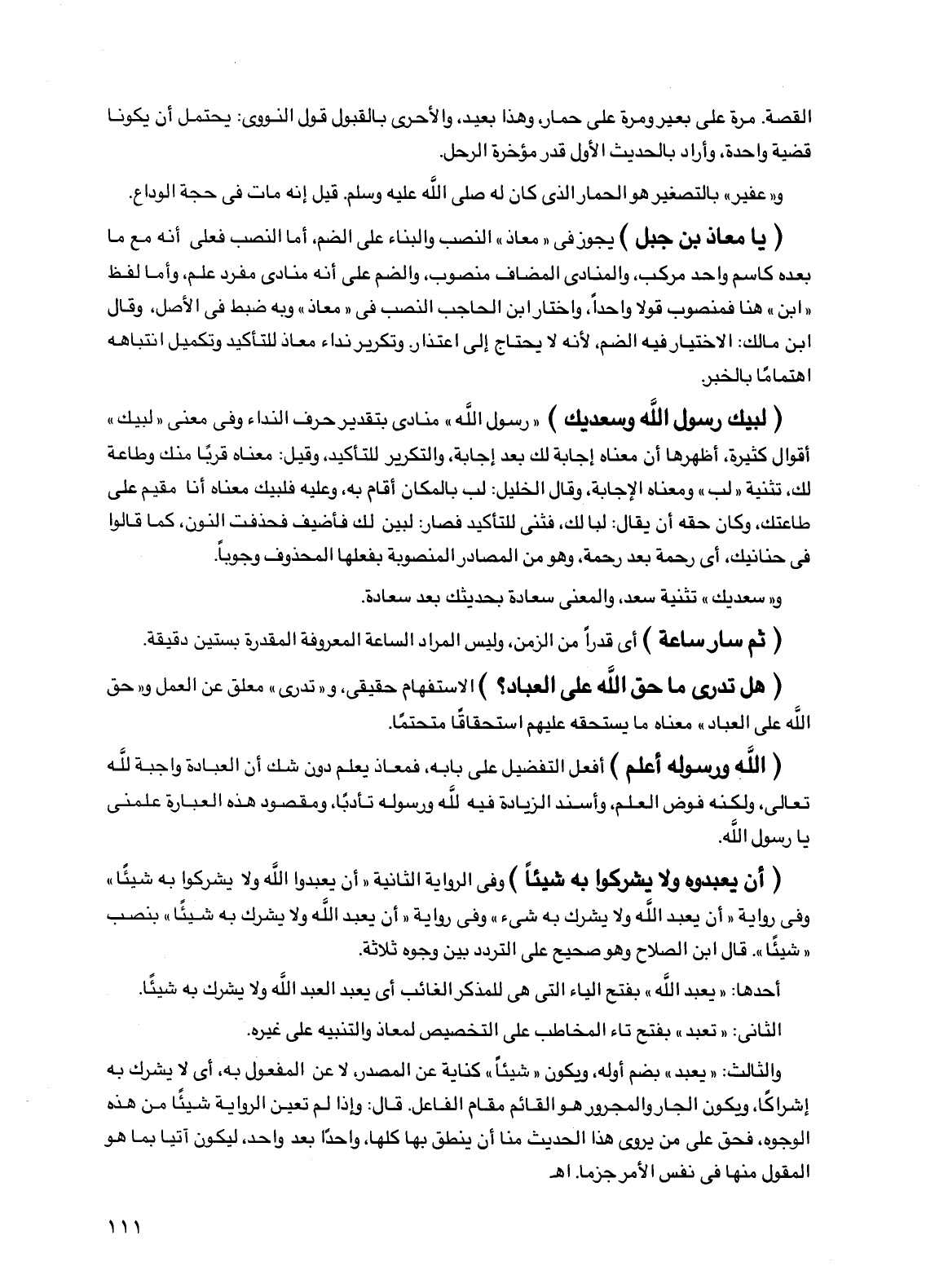 (يا معاذ بن جبل) يجوز في "معاذ" النصب والبناء على الضم، أما النصب فعلى أنه مع ما بعده كاسم واحد مركب، والمنادى المضاف منصوب، والضم على أنه منادى مفرد علم، وأما لفظ "ابن" هنا فمنصوب قولا واحدا، واختار ابن الحاجب النصب في "معاذ" وبه ضبط في الأصل، وقال ابن مالك: الاختيار فيه الضم، لأنه لا يحتاج إلى اعتذار، وتكرير نداء معاذ للتأكيد وتكميل انتباهه اهتماما بالخبر.