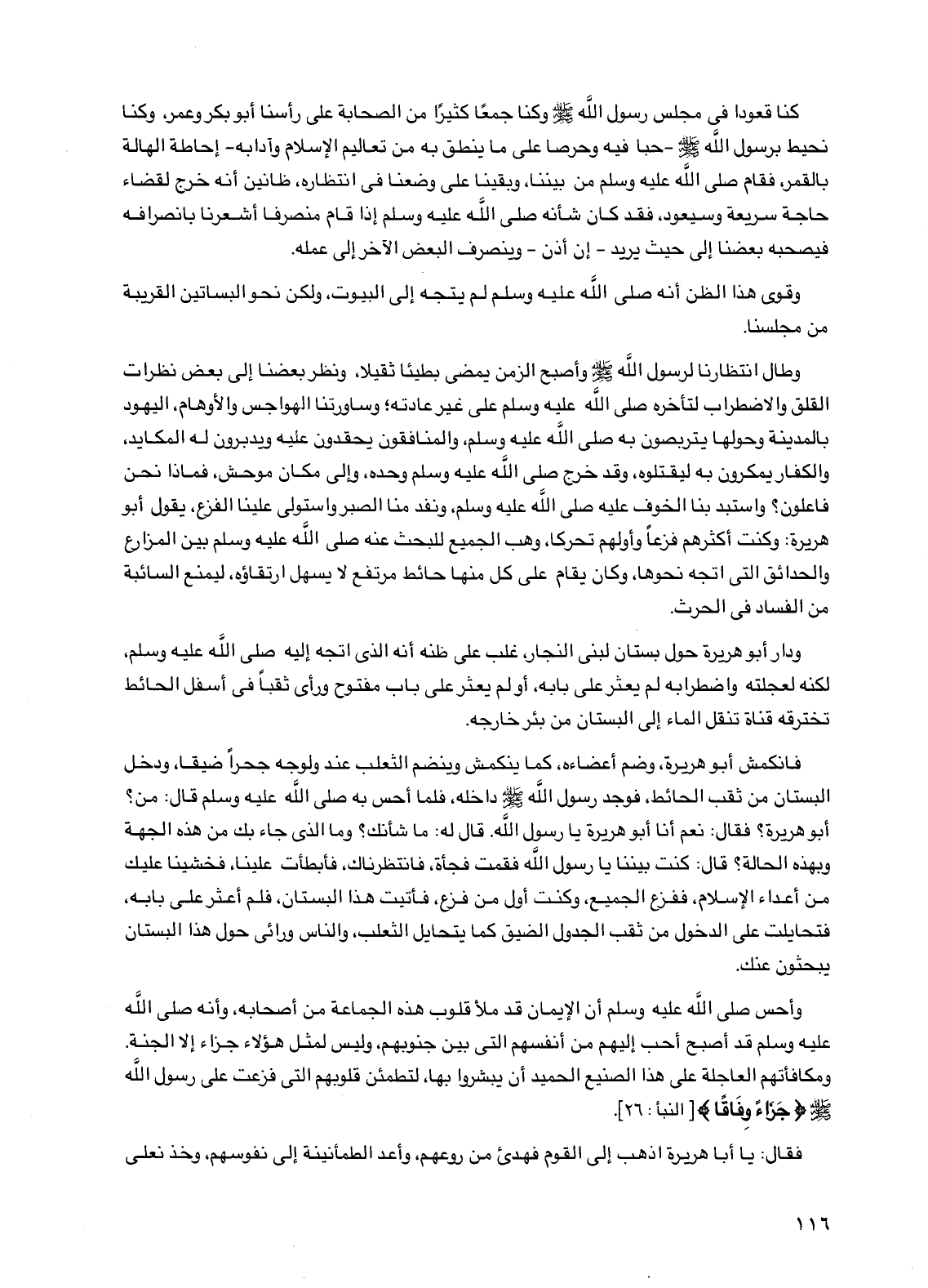 وطال انتظارنا لرسول الله صلى الله عليه وسلم وأصبح الزمن يمضي بطيئا ثقيلا، ونظر بعضنا إلى بعض نظرات القلق والاضطراب لتأخره صلى الله عليه وسلم على غير عادته، وساورتنا الهواجس والأوهام، اليهود بالمدينة وحولها يتربصون به صلى الله عليه وسلم، والمنافقون يحقدون عليه ويدبرون له المكايد، والكفار يمكرون به ليقتلوه، وقد خرج صلى الله عليه وسلم وحده، وإلى مكان موحش، فماذا نحن فاعلون؟ واستبد بنا الخوف عليه صلى الله عليه وسلم، ونفد منا الصبر واستولى علينا الفزع، يقول أبو هريرة: وكنت أكثرهم فزعا وأولهم تحركا، وهب الجميع للبحث عنه صلى الله عليه وسلم بين المزارع والحدائق التي اتجه نحوها، وكان يقام على كل منها حائط مرتفع لا يسهل ارتقاؤه، ليمنع السائبة من الفساد في الحرث.