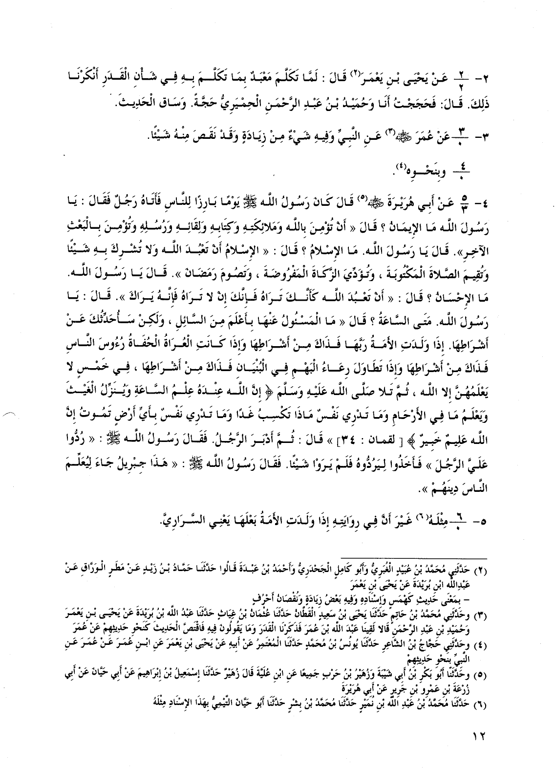 4 - عن أبي هريرة رضي الله عنه قال كان رسول الله صلى الله عليه وسلم يوما بارزا للناس فأتاه رجل فقال يا رسول الله ما الإيمان؟ قال "أن تؤمن بالله وملائكته وكتابه ولقائه ورسله وتؤمن بالبعث الآخر "قال يا رسول الله ما الإسلام؟ قال "الإسلام أن تعبد الله ولا تشرك به شيئا وتقيم الصلاة المكتوبة وتؤدي الزكاة المفروضة وتصوم رمضان" قال يا رسول الله ما الإحسان؟ قال "أن تعبد الله كأنك تراه فإنك إن لا تراه فإنه يراك". قال: يا رسول الله متى الساعة؟ قال "ما المسئول عنها بأعلم من السائل ولكن سأحدثك عن أشراطها إذا ولدت الأمة ربها فذاك من أشراطها وإذا كانت العراة الحفاة رءوس الناس فذاك من أشراطها وإذا تطاول رعاء البهم في البنيان فذاك من أشراطها، في خمس لا يعلمهن إلا الله ثم تلا صلى الله عليه وسلم {إن الله عنده علم الساعة وينزل الغيث ويعلم ما في الأرحام وما تدري نفس ماذا تكسب غدا وما تدري نفس بأي أرض تموت إن الله عليم خبير} [لقمان: 34] قال ثم أدبر الرجل فقال رسول الله صلى الله عليه وسلم" ردوا علي الرجل " فأخذوا ليردوه فلم يروا شيئا. فقال رسول الله صلى الله عليه وسلم "هذا جبريل جاء ليعلم الناس دينهم"