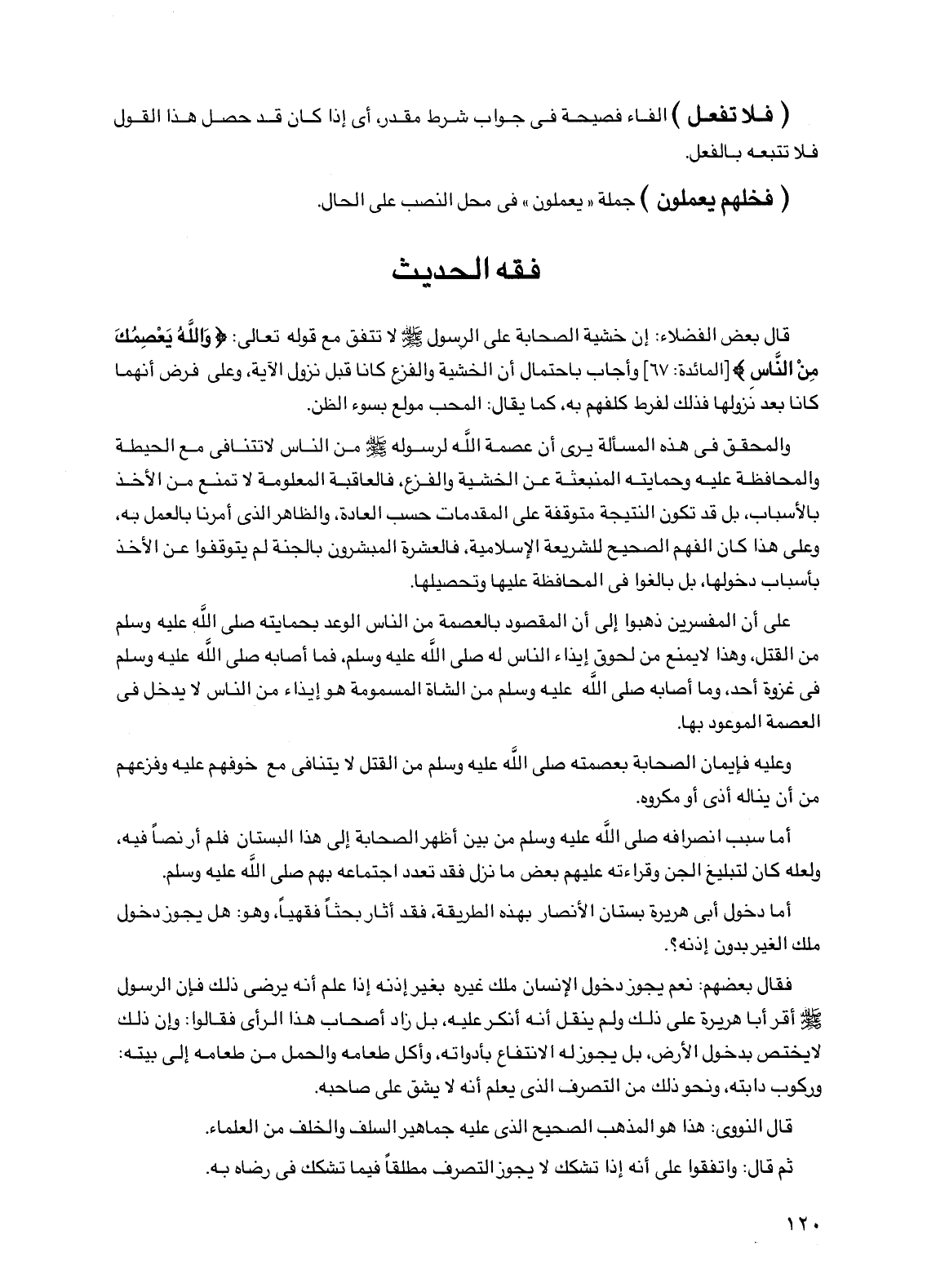 والمحقق في هذه المسألة يرى أن عصمة الله لرسوله صلى الله عليه وسلم من الناس لا تتنافى مع الحيطة والمحافظة عليه وحمايته المنبعثة عن الخشية والفزع، فالعاقبة المعلومة لا تمنع من الأخذ بالأسباب، بل قد تكون النتيجة متوقفة على المقدمات حسب العادة، والظاهر الذي أمرنا بالعمل به، وعلى هذا كان الفهم الصحيح للشريعة الإسلامية، فالعشرة المبشرون بالجنة لم يتوقفوا عن الأخذ بأسباب دخولها، بل بالغوا في المحافظة عليها وتحصيلها.