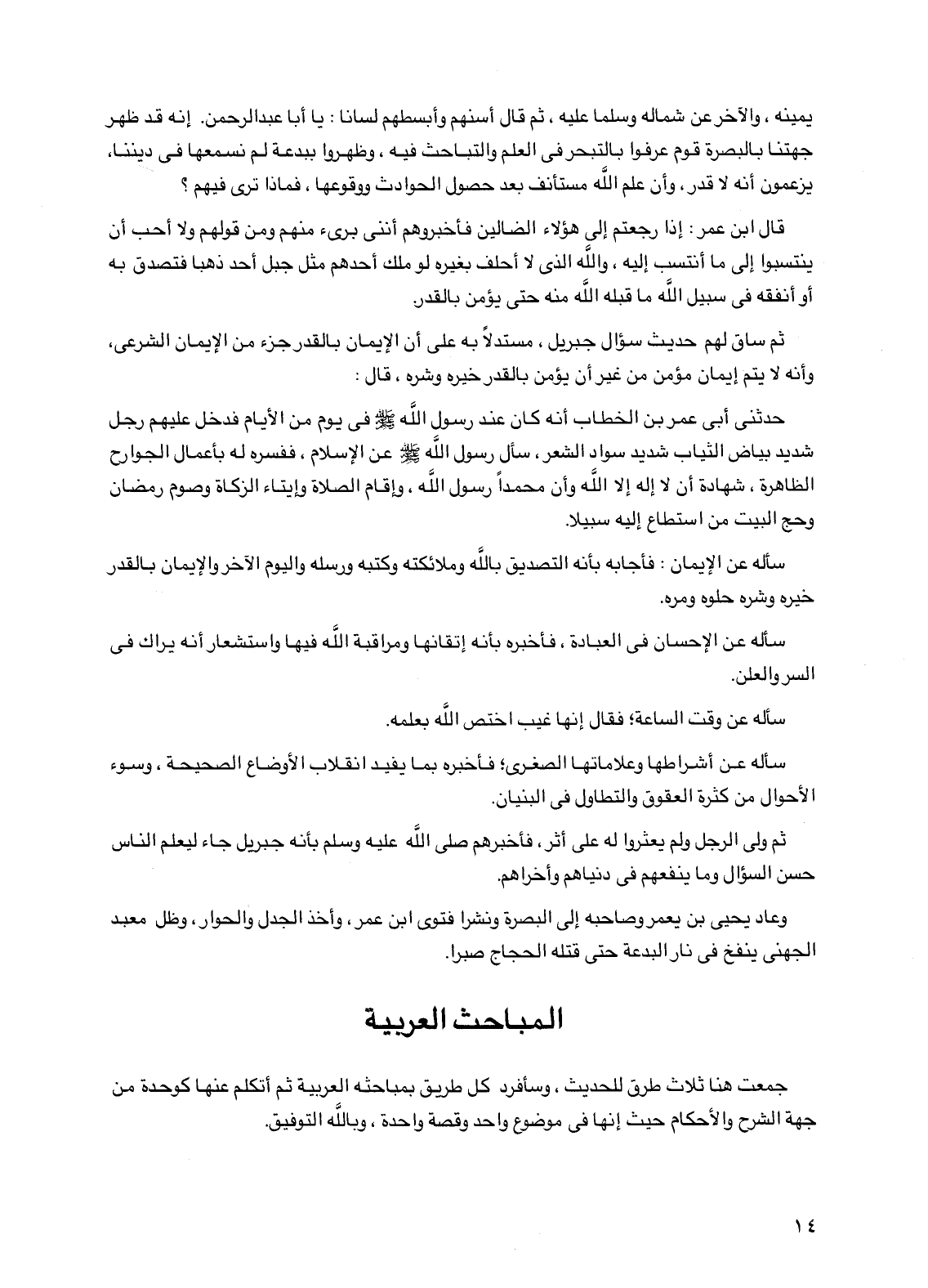 ثم ساق لهم حديث سؤال جبريل، مستدلا به على أن الإيمان بالقدر جزء من الإيمان الشرعي وأنه لا يتم إيمان مؤمن من غير أن يؤمن بالقدر خيره وشره، قال: