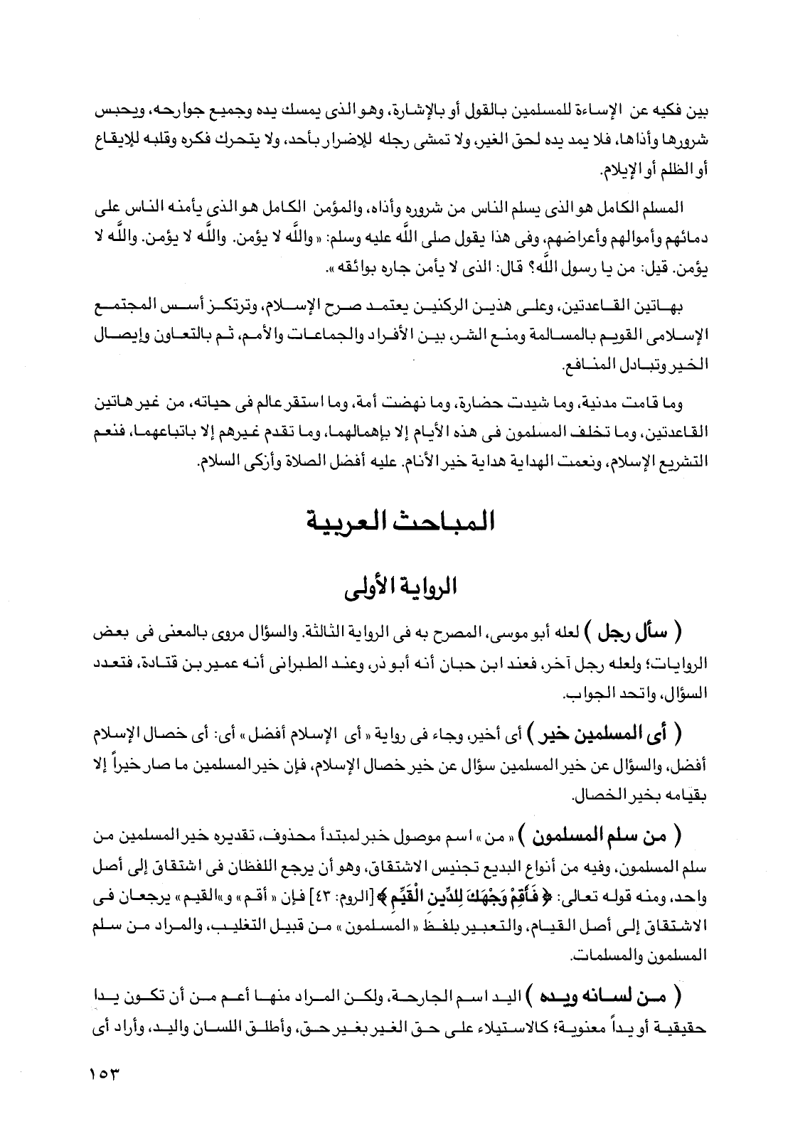 (من سلم المسلمون) "من" اسم موصول خبر لمبتدأ محذوف، تقديره خير المسلمين من سلم المسلمون، وفيه من أنواع البديع تجنيس الاشتقاق، وهو أن يرجع اللفظان في اشتقاق إلى أصل واحد، ومنه قوله تعالى: {فأقم وجهك للدين القيم} [الروم: 43] فإن "أقم" و"القيم" يرجعان في الاشتقاق إلى أصل القيام، والتعبير بلفظ "المسلمون" من قبيل التغليب، والمراد من سلم المسلمون والمسلمات.