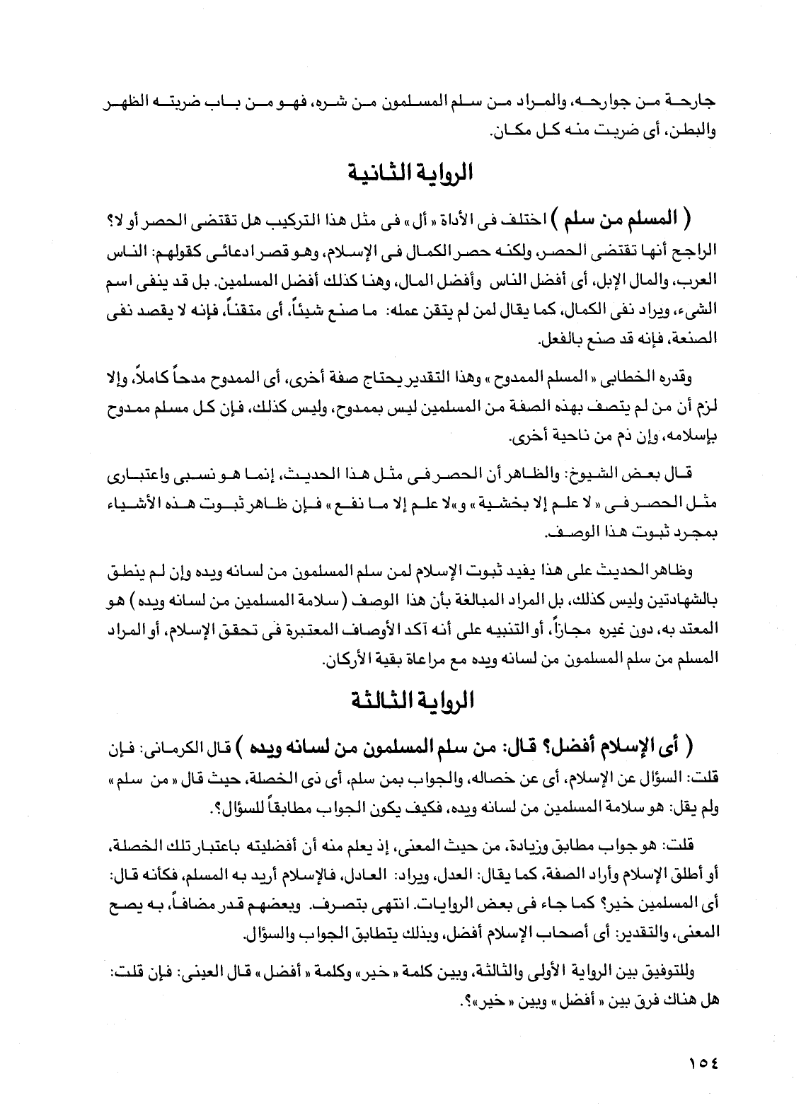 (المسلم من سلم) اختلف في الأداة "أل" في مثل هذا التركيب هل تقتضي الحصر أو لا؟ الراجح أنها تقتضي الحصر، ولكنه حصر الكمال في الإسلام، وهو قصر ادعائي كقولهم: الناس العرب، والمال الإبل، أي أفضل الناس وأفضل المال، وهنا كذلك أفضل المسلمين. بل قد ينفي اسم الشيء، ويراد نفي الكمال، كما يقال لمن لم يتقن عمله: ما صنع شيئا، أي متقنا، فإنه لا يقصد نفي الصنعة، فإنه قد صنع بالفعل.
