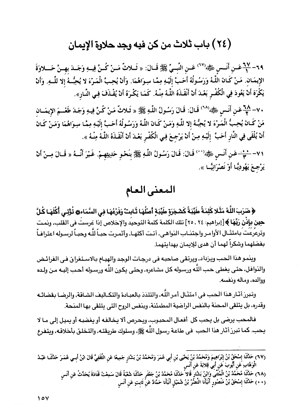 69 - عن أنس رضي الله عنه عن النبي صلى الله عليه وسلم قال: "ثلاث من كن فيه وجد بهن حلاوة الإيمان. من كان الله ورسوله أحب إليه مما سواهما. وأن يحب المرء لا يحبه إلا لله. وأن يكره أن يعود في الكفر بعد أن أنقذه الله منه. كما يكره أن يقذف في النار".