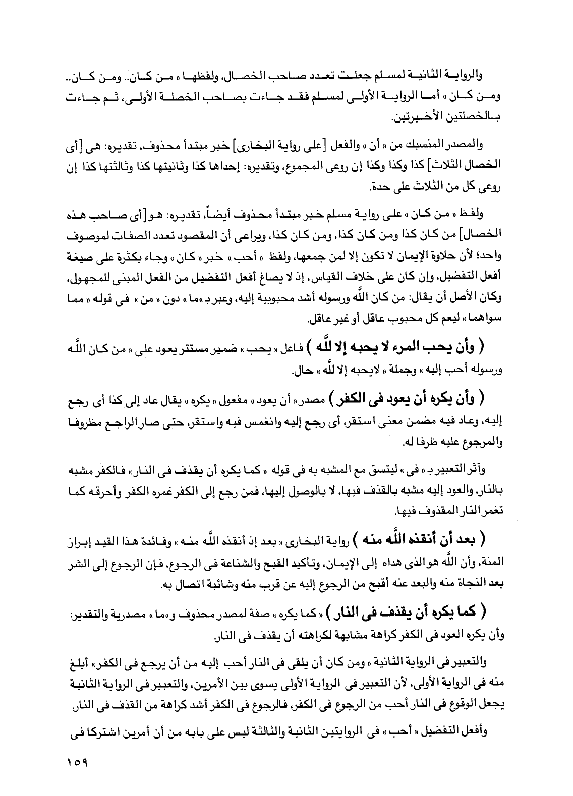 ولفظ "من كان" على رواية مسلم خبر مبتدأ محذوف أيضا، تقديره: هو [أي صاحب هذه الخصال] من كان كذا ومن كان كذا، ومن كان كذا، ويراعى أن المقصود تعدد الصفات لموصوف واحد، لأن حلاوة الإيمان لا تكون إلا لمن جمعها، ولفظ "أحب" خبر "كان" وجاء بكثرة على صيغة أفعل التفضيل، وإن كان على خلاف القياس، إذ لا يصاغ أفعل التفضيل من الفعل المبني للمجهول، وكان الأصل أن يقال: من كان الله ورسوله أشد محبوبية إليه، وعبر بـ "ما" دون "من" في قوله "مما سواهما" ليعم كل محبوب عاقل أو غير عاقل.
