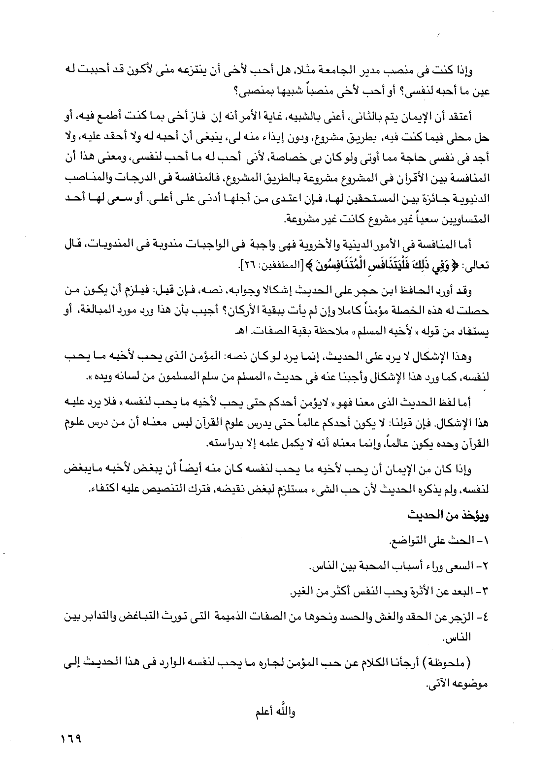 أعتقد أن الإيمان يتم بالثاني، أعني بالشبيه، غاية الأمر أنه إن فاز أخي بما كنت أطمع فيه، أو حل محلي فيما كنت فيه، بطريق مشروع، ودون إيذاء منه لي، ينبغي أن أحبه له ولا أحقد عليه، ولا أجد في نفسي حاجة مما أوتي ولو كان بي خصاصة، لأني أحب له ما أحب لنفسي، ومعنى هذا أن المنافسة بين الأقران في المشروع مشروعة بالطريق المشروع، فالمنافسة في الدرجات والمناصب الدنيوية جائزة بين المستحقين لها، فإن اعتدى من أجلها أدنى على أعلى. أو سعى لها أحد المتساويين سعيا غير مشروع كانت غير مشروعة.