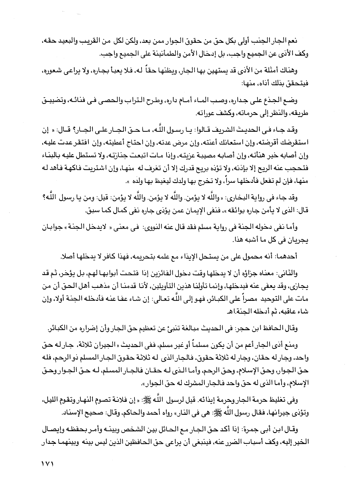 ومنع أذى الجار أعم من أن يكون مسلما أو غير مسلم، ففي الحديث "الجيران ثلاثة، جار له حق واحد، وجار له حقان، وجار له ثلاثة حقوق، فالجار الذي له ثلاثة حقوق الجار المسلم ذو الرحم، فله حق الجوار، وحق الإسلام، وحق الرحم، وأما الذي له حقان فالجار المسلم، له حق الجوار وحق الإسلام، وأما الذي له حق واحد فالجار المشرك له حق الجوار".