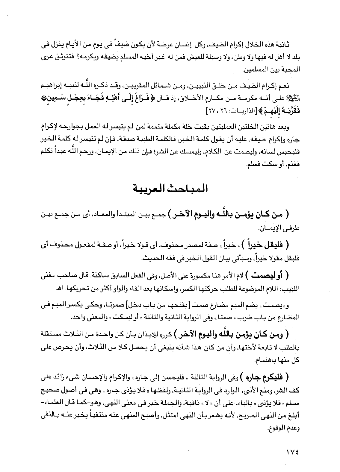 (فليكرم جاره) وفي الرواية الثالثة "فليحسن إلى جاره" والإكرام والإحسان شيء زائد على كف الشر، ومنع الأذى، الوارد في الرواية الثانية، ولفظها "فلا يؤذي جاره" وهي في أصول صحيح مسلم "فلا يؤذي" بالياء، على أن "لا" نافية، والجملة خبر في معنى النهي، وهو -كما قال العلماء- أبلغ من النهي الصريح، لأنه يشعر بأن النهي امتثل، وأصبح المنهي عنه منتفيا يخبر عنه بالنفي وعدم الوقوع.