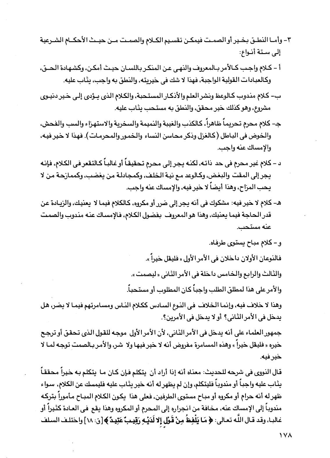3 - وأما النطق بخير أو الصمت فيمكن تقسيم الكلام والصمت من حيث الأحكام الشرعية إلى ستة أنواع: