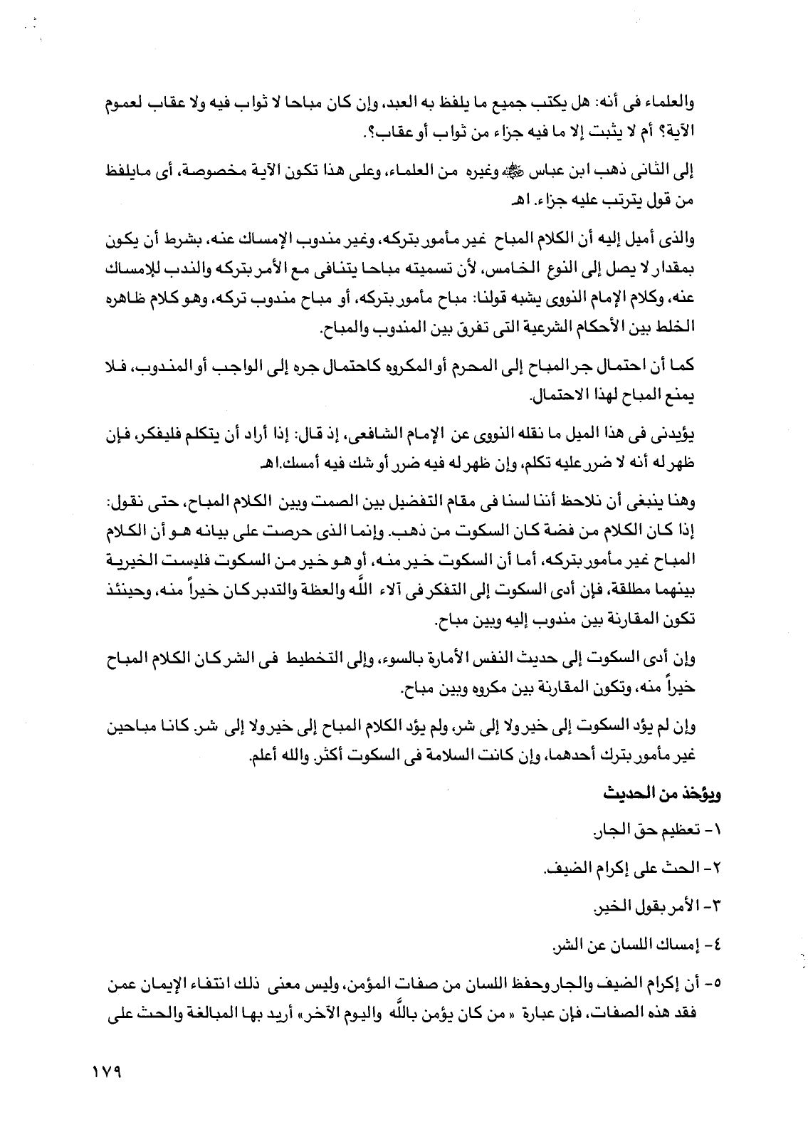 5 - أن إكرام الضيف والجار وحفظ اللسان من صفات المؤمن، وليس معنى ذلك انتفاء الإيمان عمن فقد هذه الصفات، فإن عبارة "من كان يؤمن بالله واليوم الآخر" أريد بها المبالغة والحث على