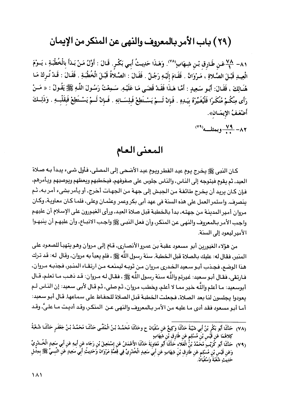 81 - عن طارق بن شهاب. وهذا حديث أبي بكر. قال: أول من بدأ بالخطبة، يوم العيد قبل الصلاة، مروان. فقام إليه رجل. فقال: الصلاة قبل الخطبة. فقال: قد ترك ما هنالك، فقال: أبو سعيد: أما هذا فقد قضى ما عليه. سمعت رسول الله صلى الله عليه وسلم يقول: "من رأى منكم منكرا فليغيره بيده. فإن لم يستطع فبلسانه. فإن لم يستطع فبقلبه. وذلك أضعف الإيمان.