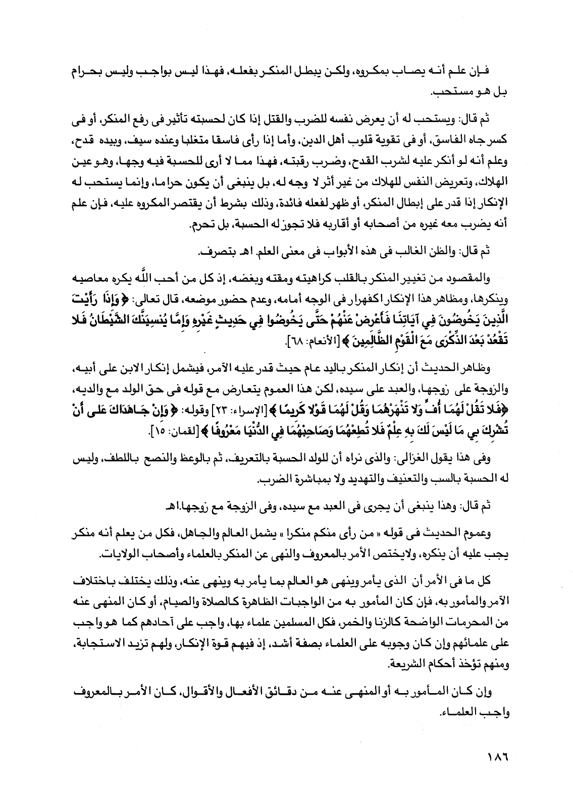 ثم قال: ويستحب له أن يعرض نفسه للضرب والقتل إذا كان لحسبته تأثير في رفع المنكر، أو في كسر جاه الفاسق، أو في تقوية قلوب أهل الدين، وأما إذا رأى فاسقا متغلبا وعنده سيف، وبيده قدح، وعلم أنه لو أنكر عليه لشرب القدح، وضرب رقبته، فهذا مما لا أرى للحسبة فيه وجها، وهو عين الهلاك، وتعريض النفس للهلاك من غير أثر لا وجه له، بل ينبغي أن يكون حراما، وإنما يستحب له الإنكار إذا قدر على إبطال المنكر، أو ظهر لفعله فائدة، وذلك بشرط أن يقتصر المكروه عليه، فإن علم أنه يضرب معه غيره من أصحابه أو أقاربه فلا تجوز له الحسبة، بل تحرم.