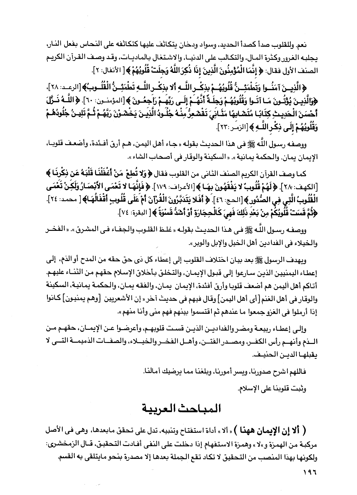 (ألا إن الإيمان ههنا) "ألا" أداة استفتاح وتنبيه، تدل على تحقق ما بعدها، وهي في الأصل مركبة من الهمزة و"لا" وهمزة الاستفهام إذا دخلت على النفي أفادت التحقيق، قال الزمخشري: ولكونها بهذا المنصب من التحقيق لا تكاد تقع الجملة بعدها إلا مصدرة بنحو ما يتلقى به القسم.
