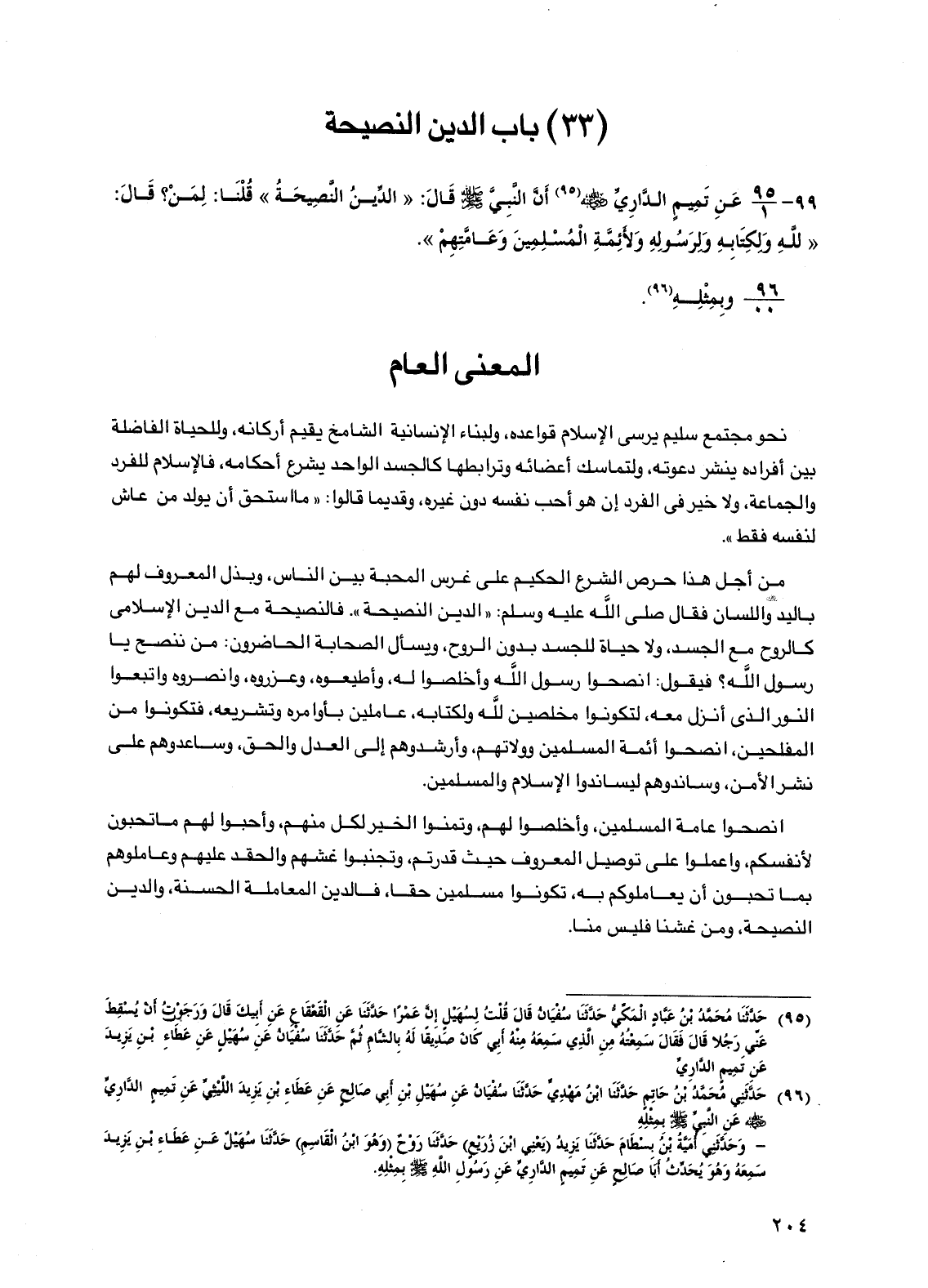 99 - عن تميم الداري رضي الله عنه أن النبي صلى الله عليه وسلم قال: "الدين النصيحة" قلنا: لمن؟ قال: "لله ولكتابه ولرسوله ولأئمة المسلمين وعامتهم".
