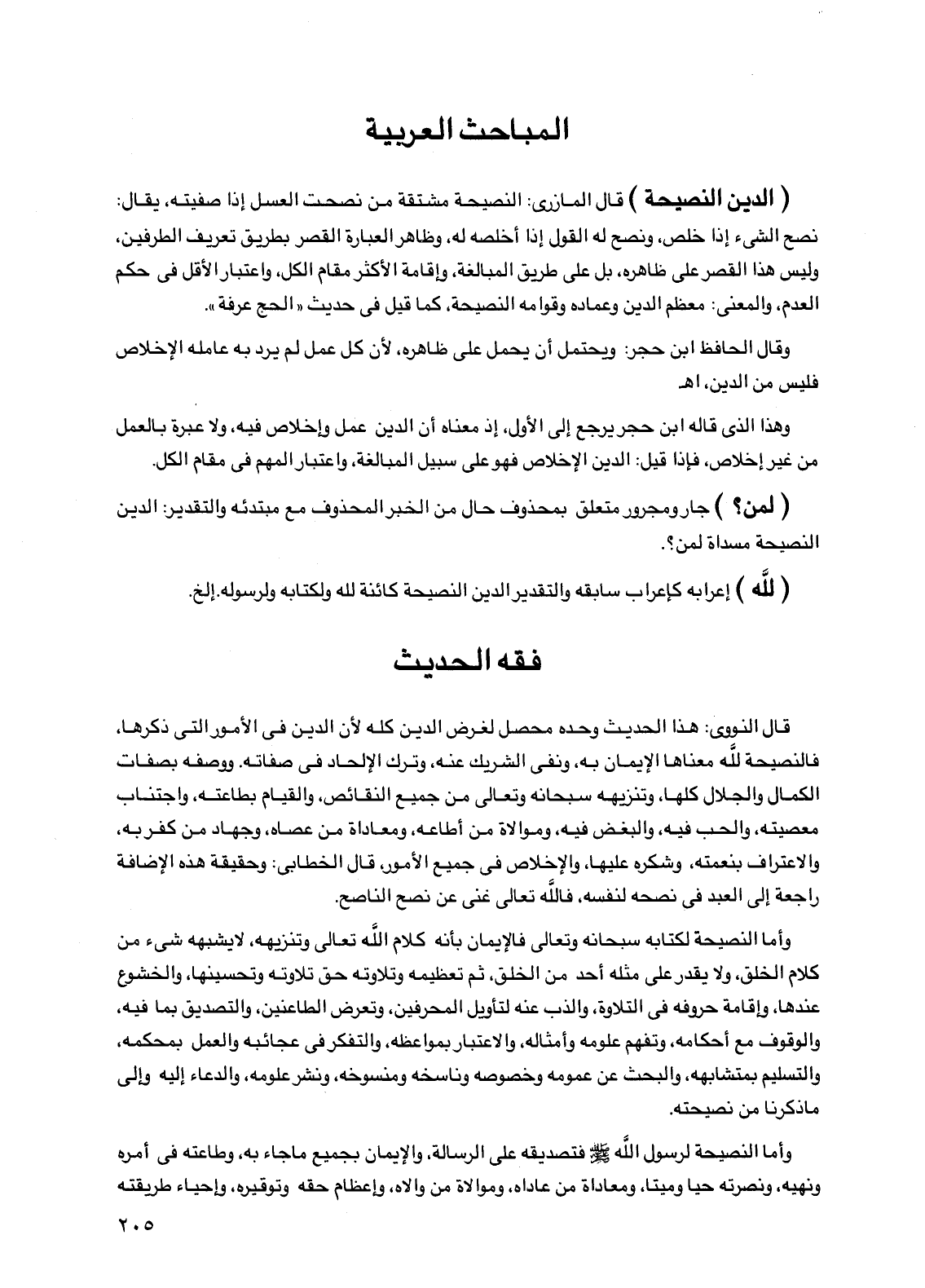 (الدين النصيحة) قال المازري: النصيحة مشتقة من نصحت العسل إذا صفيته، يقال: نصح الشيء إذا خلص، ونصح له القول إذا أخلصه له، وظاهر العبارة القصر بطريق تعريف الطرفين، وليس هذا القصر على ظاهره، بل على طريق المبالغة، وإقامة الأكثر مقام الكل، واعتبار الأقل في حكم العدم، والمعنى: معظم الدين وعماده وقوامه النصيحة، كما قيل في حديث "الحج عرفة".
