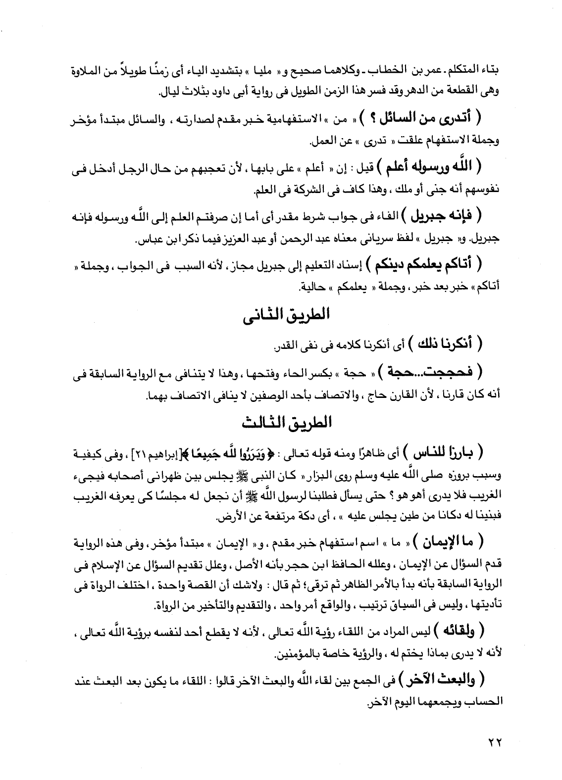 (ما الإيمان) "ما" اسم استفهام خبر مقدم، و"الإيمان" مبتدأ مؤخر، وفي هذه الرواية قدم السؤال عن الإيمان، وعلله الحافظ ابن حجر بأنه الأصل، وعلل تقديم السؤال عن الإسلام في الرواية السابقة بأنه بدأ بالأمر الظاهر ثم ترقى، ثم قال: ولا شك أن القصة واحدة، اختلف الرواة في تأديتها، وليس في السياق ترتيب والواقع أمر واحد، والتقديم والتأخير من الرواة.