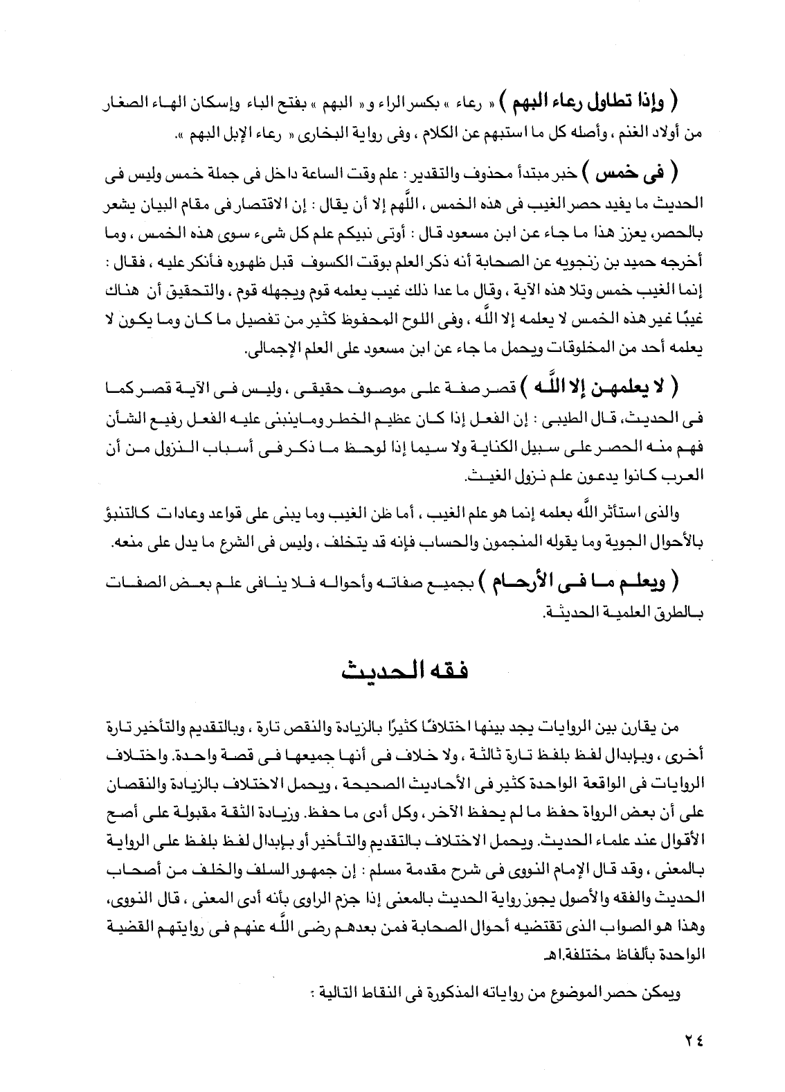 (لا يعلمهن إلا الله) قصر صفة على موصوف حقيقي، وليس في الآية قصر كما في الحديث، قال الطيبي: إن الفعل إذا كان عظيم الخطر وما ينبني عليه الفعل رفيع الشأن فهم منه الحصر على سبيل الكناية ولا سيما إذا لوحظ ما ذكر في أسباب النزول من أن العرب كانوا يدعون علم نزول الغيث.