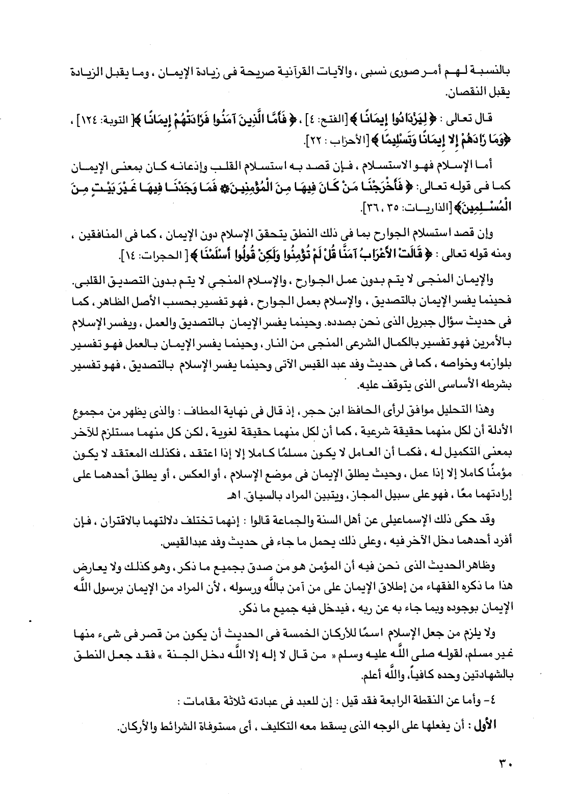والإيمان المنجي لا يتم بدون عمل الجوارح، والإسلام المنجي لا يتم بدون التصديق القلبي. فحينما يفسر الإيمان بالتصديق، والإسلام بعمل الجوارح، فهو تفسير بحسب الأصل الظاهر، كما في حديث سؤال جبريل الذي نحن بصدده. وحينما يفسر الإيمان بالتصديق والعمل، ويفسر الإسلام بالأمرين فهو تفسير بالكمال الشرعي المنجي من النار، وحينما يفسر الإيمان بالعمل فهو تفسير بلوازمه وخواصه، كما في حديث وفد عبد القيس الآتي وحينما يفسر الإسلام بالتصديق، فهو تفسير بشرطه الأساسي الذي يتوقف عليه.