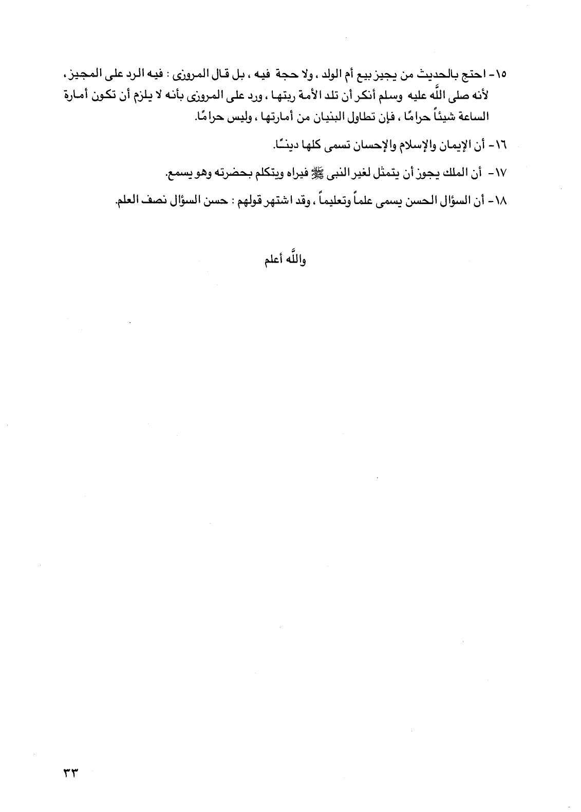 15 - احتج بالحديث من يجيز بيع أم الولد، ولا حجة فيه، بل قال المروزي: فيه الرد على المجيز، لأنه صلى الله عليه وسلم أنكر أن تلد الأمة ربتها، ورد على المروزي بأنه لا يلزم أن تكون أمارة الساعة شيئا حراما، فإن تطاول البنيان من أمارتها، وليس حراما.