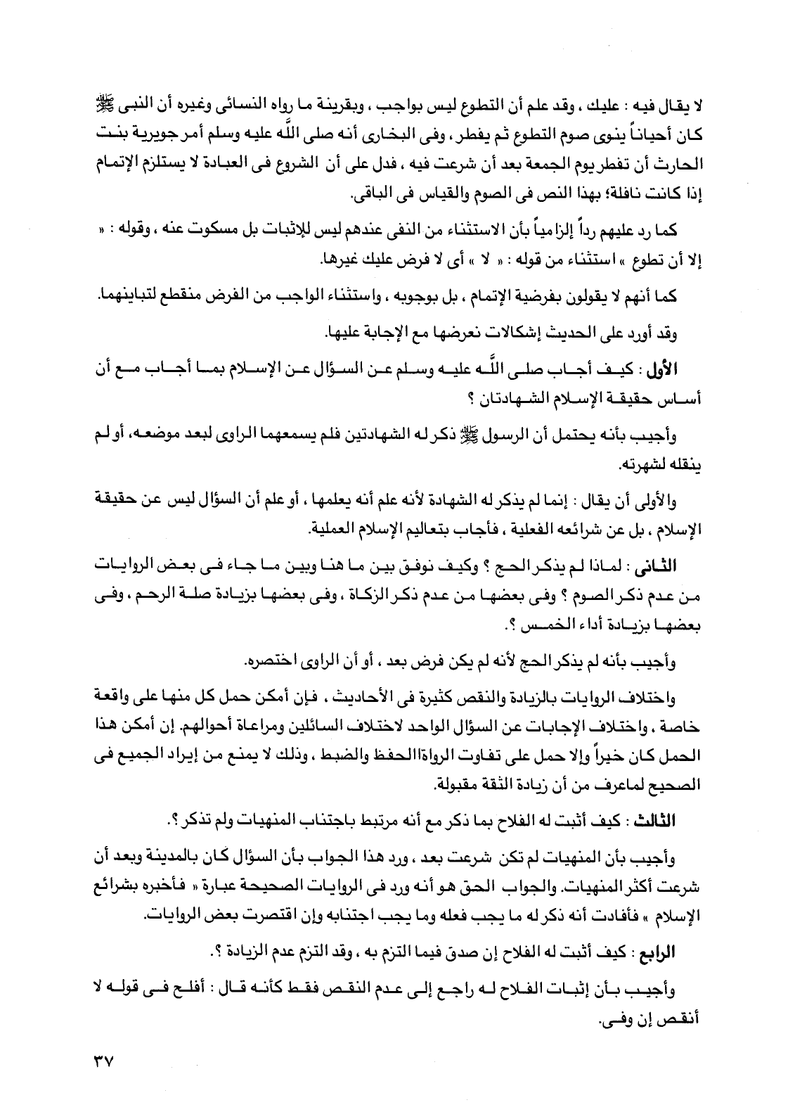 وأجيب بأن المنهيات لم تكن شرعت بعد، ورد هذا الجواب بأن السؤال كان بالمدينة وبعد أن شرعت أكثر المنهيات. والجواب الحق هو أنه ورد في الروايات الصحيحة عبارة "فأخبره بشرائع الإسلام" فأفادت أنه ذكر له ما يجب فعله وما يجب اجتنابه وإن اقتصرت بعض الروايات.