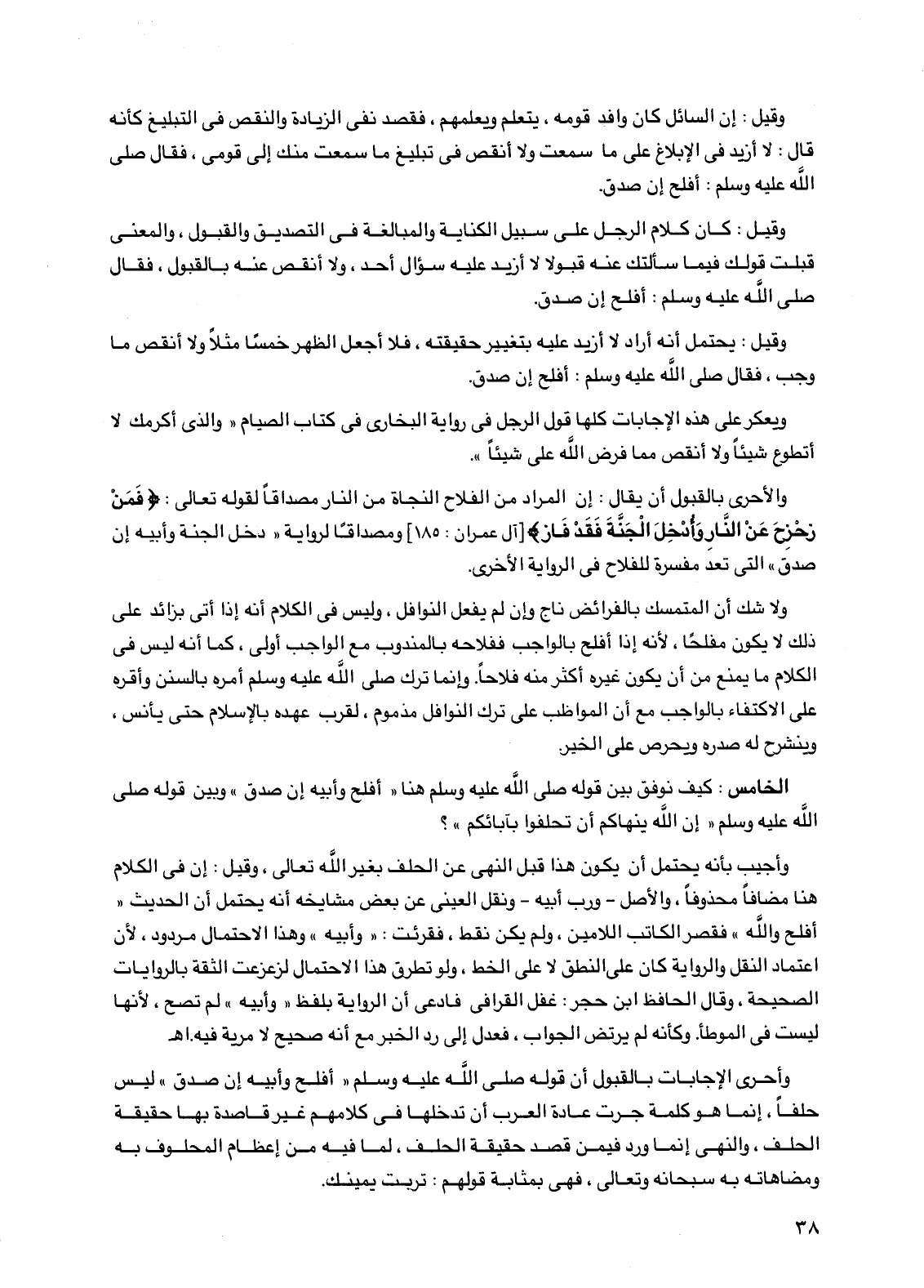وقيل: إن السائل كان وافد قومه، يتعلم ويعلمهم، فقصد نفي الزيادة والنقص في التبليغ كأنه قال: لا أزيد في الإبلاغ على ما سمعت ولا أنقص في تبليغ ما سمعت منك إلى قومي، فقال صلى الله عليه وسلم: أفلح إن صدق.