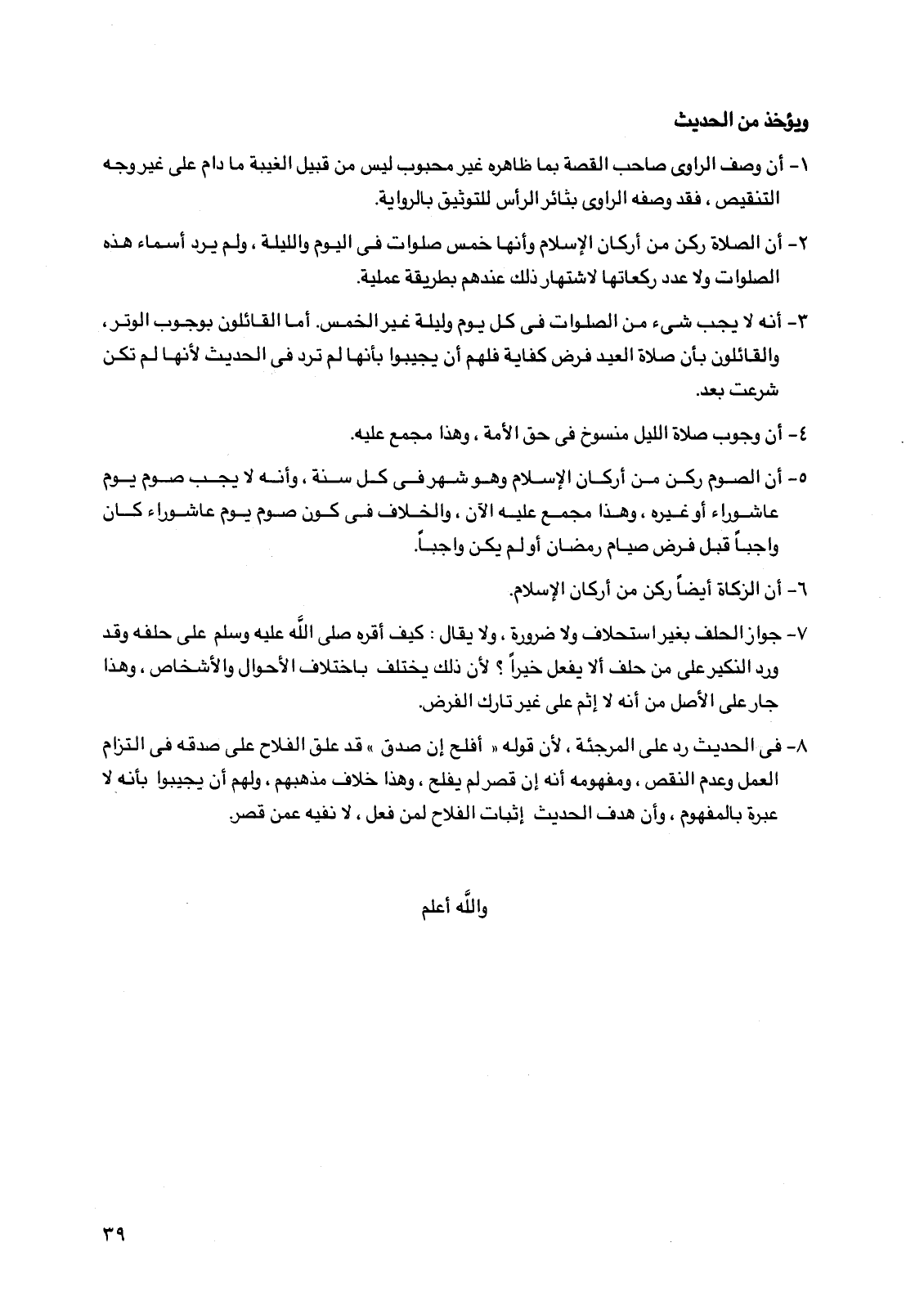 3 - أنه لا يجب شيء من الصلوات في كل يوم وليلة غير الخمس. أما القائلون بوجوب الوتر، والقائلون بأن صلاة العيد فرض كفاية فلهم أن يجيبوا بأنها لم ترد في الحديث لأنها لم تكن شرعت بعد.