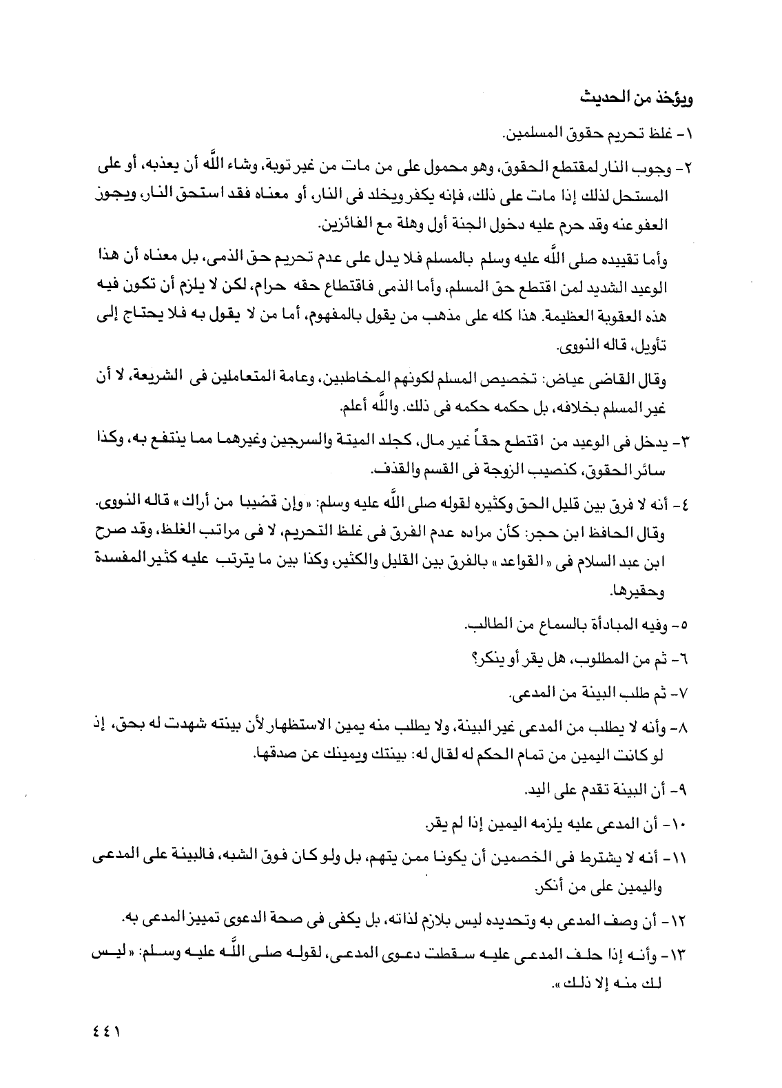 2 - وجوب النار لمقتطع الحقوق، وهو محمول على من مات من غير توبة، وشاء الله أن يعذبه، أو على المستحل لذلك إذا مات على ذلك، فإنه يكفر ويخلد في النار، أو معناه فقد استحق النار، ويجوز العفو عنه وقد حرم عليه دخول الجنة أول وهلة مع الفائزين.