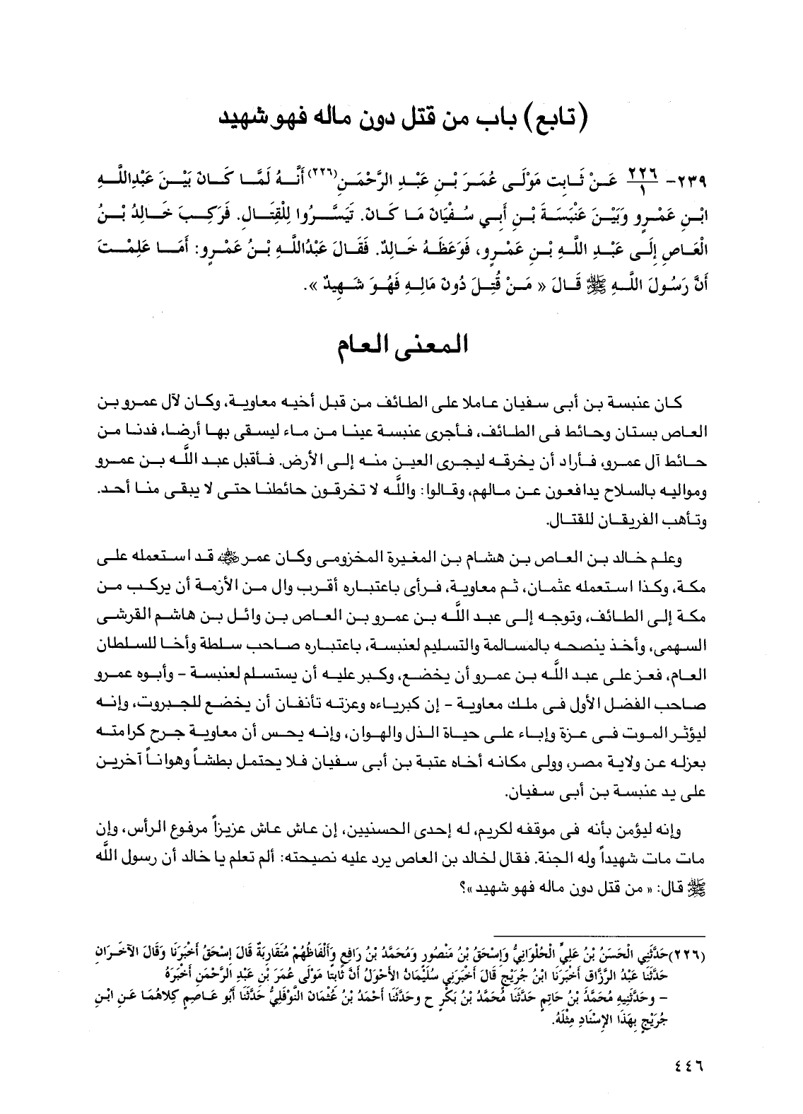 239 - عن ثابت مولى عمر بن عبد الرحمن أنه لما كان بين عبد الله بن عمرو وبين عنبسة بن أبي سفيان ما كان. تيسروا للقتال. فركب خالد بن العاص إلى عبد الله بن عمرو، فوعظه خالد. فقال عبد الله بن عمرو: أما علمت أن رسول الله صلى الله عليه وسلم قال: "من قتل دون ماله فهو شهيد".