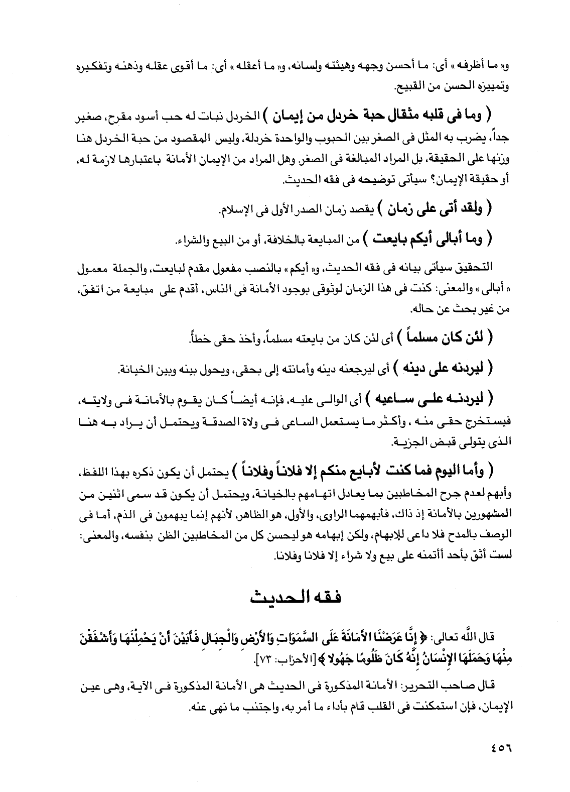 قال صاحب التحرير: الأمانة المذكورة في الحديث هي الأمانة المذكورة في الآية، وهي عين الإيمان، فإن استمكنت في القلب قام بأداء ما أمر به، واجتنب ما نهي عنه.