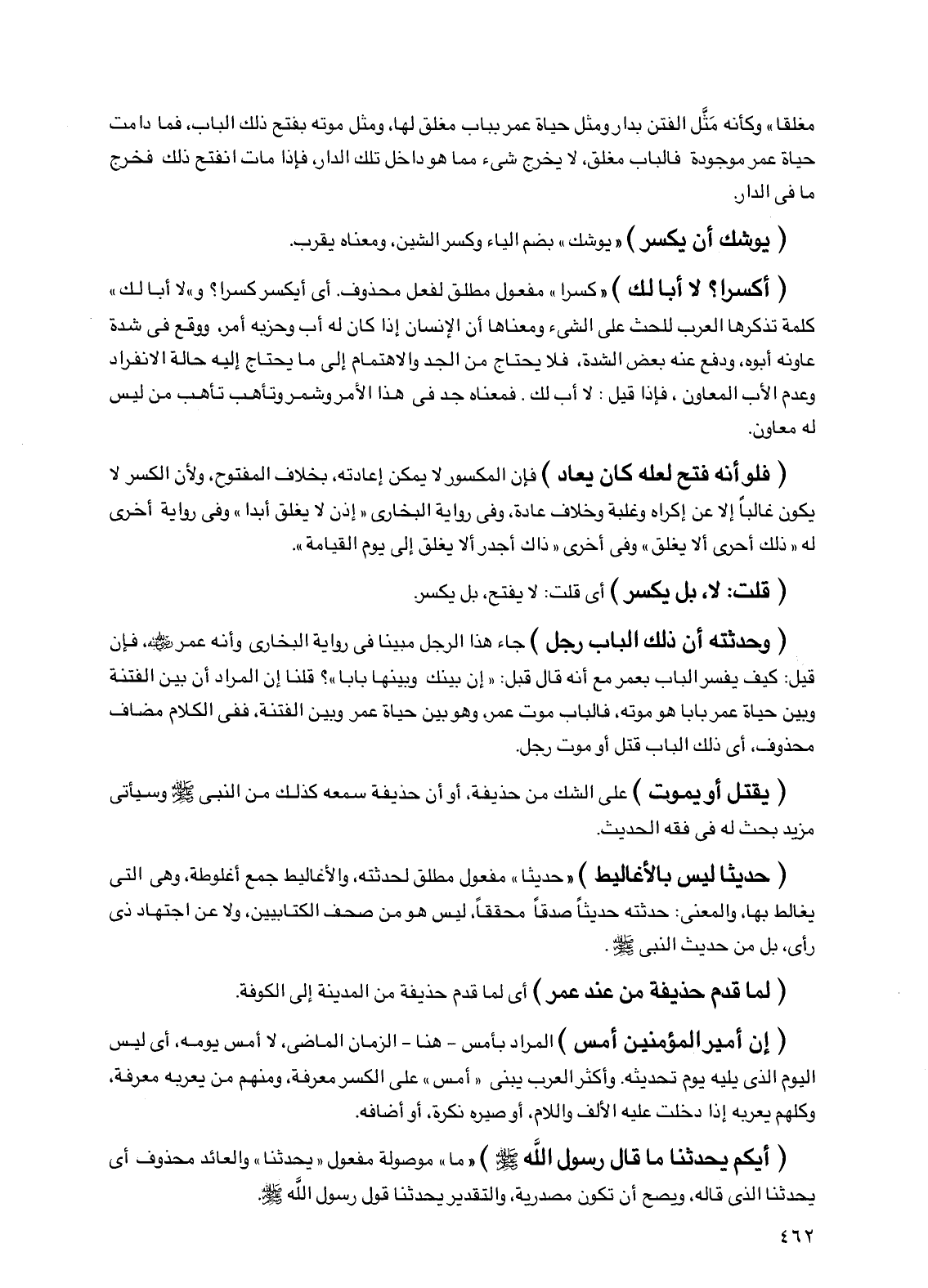 (فلو أنه فتح لعله كان يعاد) فإن المكسور لا يمكن إعادته، بخلاف المفتوح، ولأن الكسر لا يكون غالبا إلا عن إكراه وغلبة وخلاف عادة، وفي رواية البخاري "إذن لا يغلق أبدا" وفي رواية أخرى له "ذلك أحرى ألا يغلق" وفي أخرى "ذاك أجدر ألا يغلق إلى يوم القيامة".