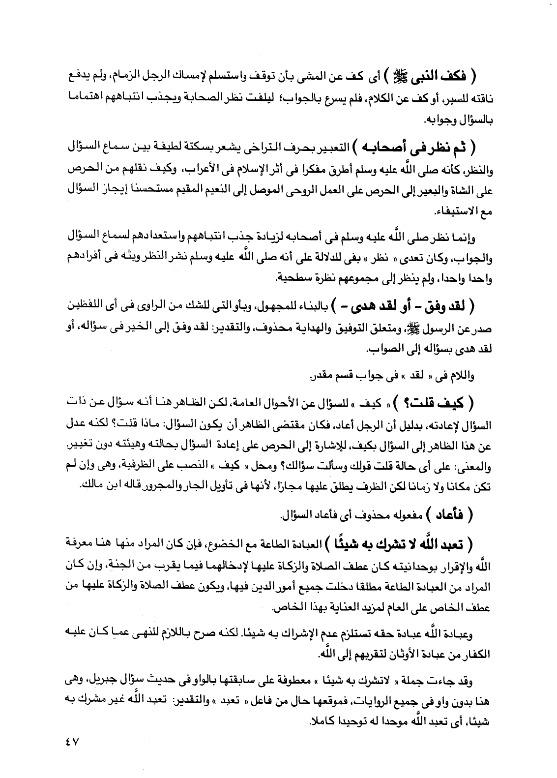 (ثم نظر في أصحابه) التعبير بحرف التراخي يشعر بسكتة لطيفة بين سماع السؤال والنظر، كأنه صلى الله عليه وسلم أطرق مفكرا في أثر الإسلام في الأعراب، وكيف نقلهم من الحرص على الشاة والبعير إلى الحرص على العمل الروحي الموصل إلى النعيم المقيم مستحسنا إيجاز السؤال مع الاستيفاء.