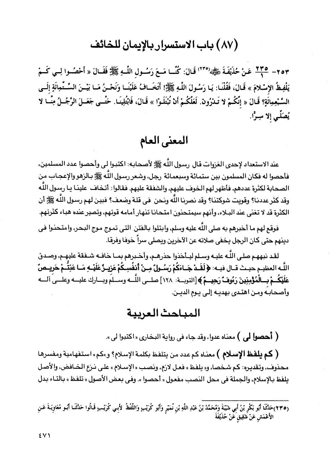 253 - عن حذيفة رضي الله عنه قال: كنا مع رسول الله صلى الله عليه وسلم فقال: "أحصوا لي كم يلفظ الإسلام" قال، فقلنا: يا رسول الله صلى الله عليه وسلم أتخاف علينا ونحن ما بين الستمائة إلى السبعمائة؟ قال: "إنكم لا تدرون لعلكم أن تبتلوا" قال: فابتلينا. حتى جعل الرجل منا لا يصلي إلا سرا.