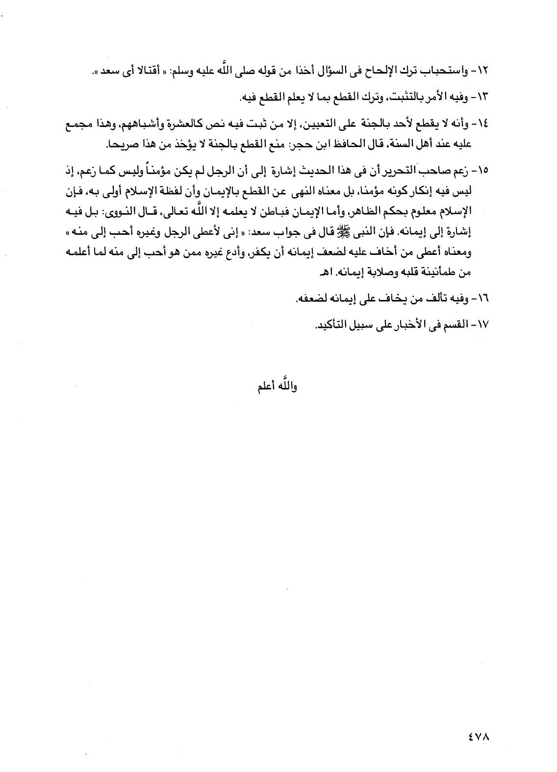 15 - زعم صاحب التحرير أن في هذا الحديث إشارة إلى أن الرجل لم يكن مؤمنا وليس كما زعم، إذ ليس فيه إنكار كونه مؤمنا، بل معناه النهي عن القطع بالإيمان وأن لفظة الإسلام أولى به، فإن الإسلام معلوم بحكم الظاهر، وأما الإيمان فباطن لا يعلمه إلا الله تعالى، قال النووي: بل فيه إشارة إلى إيمانه، فإن النبي صلى الله عليه وسلم قال في جواب سعد: "إني لأعطي الرجل وغيره أحب إلي منه" ومعناه أعطي من أخاف عليه لضعف إيمانه أن يكفر، وأدع غيره ممن هو أحب إلي منه لما أعلمه من طمأنينة قلبه وصلابة إيمانه. اهـ.