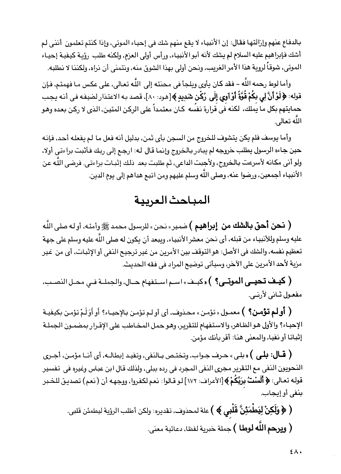 بالدفاع عنهم وإزالتها فقال: إن الأنبياء لا يقع منهم شك في إحياء الموتى، وإذا كنتم تعلمون أنني لم أشك فإبراهيم عليه السلام لم يشك لأنه أبو الأنبياء، ورأس أولي العزم، ولكنه طلب رؤية كيفية إحياء الموتى، شوقا لرؤية هذا الأمر الغريب، ونحن أولى بهذا الشوق منه، ونتمنى أن نراه، ولكننا لا نطلبه.